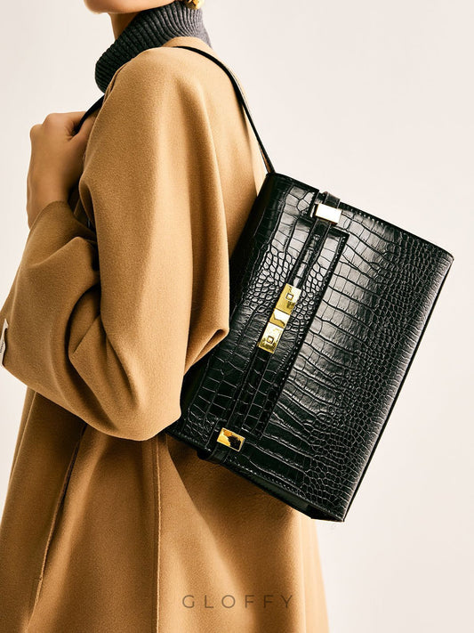 Timsah Kabartmalı Gerçek Deri Büyük El Çantası