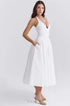 Bu midi elbise boyundan bağlamalı bir tasarıma, kolsuz kesime ve göz kamaştıran A kesim bir siluete sahiptir. Açık arka tasarım ve file ek kısım, modern ve sofistike bir dokunuş katıyor.