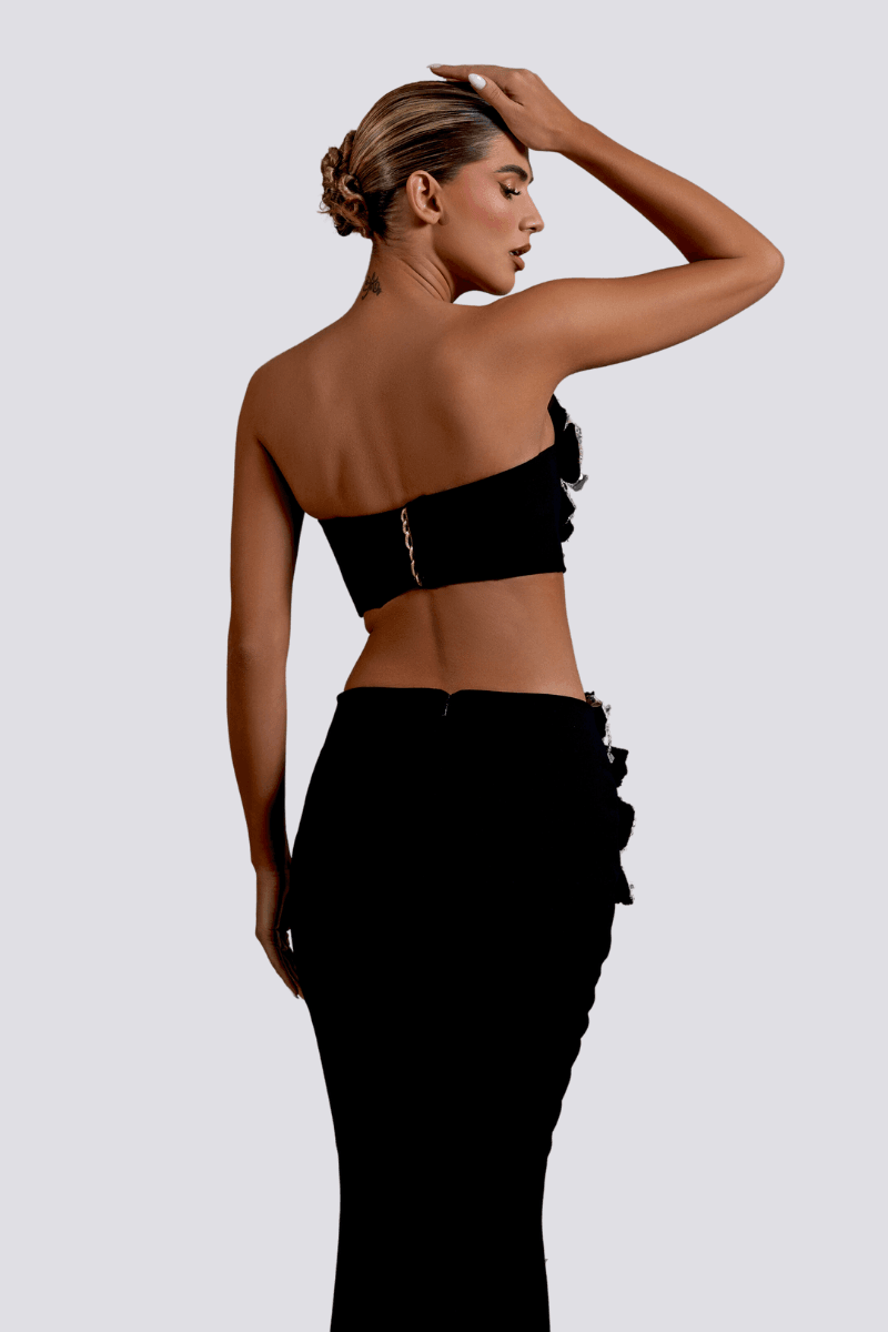 - Tasarım: Yapay Elmas Çiçek Süslemeli Askısız Üst, Bedene Oturan Bodycon Etek