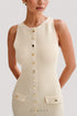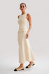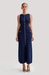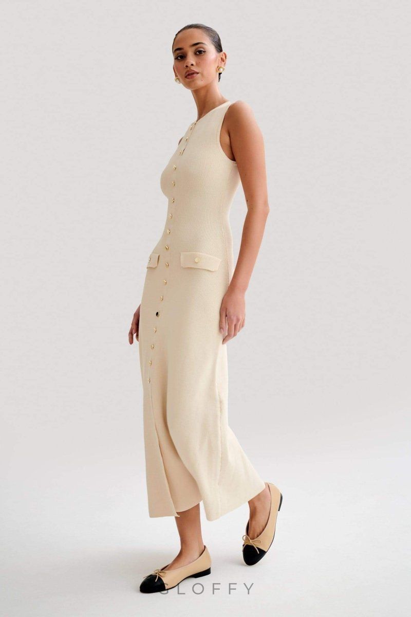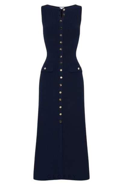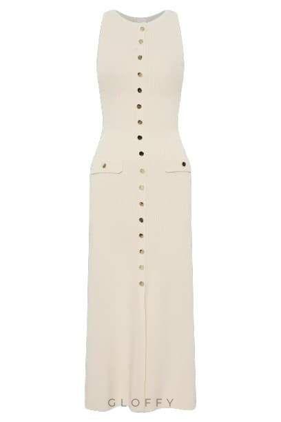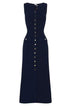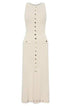 Yuvarlak yakalı ve kolsuz tasarıma sahip bu zarif maksi elbise, modern tarzı klasik detaylarla birleştiriyor. Düz etek şekli ve ön sahte cepler, altın düğmelerle süslenerek sofistike bir dokunuş katıyor. Yüksek esnekliğe sahip trikodan üretilen bu ürün, vücudunuzu rahatça güzelleştiren güzel bir uyum sağlar.