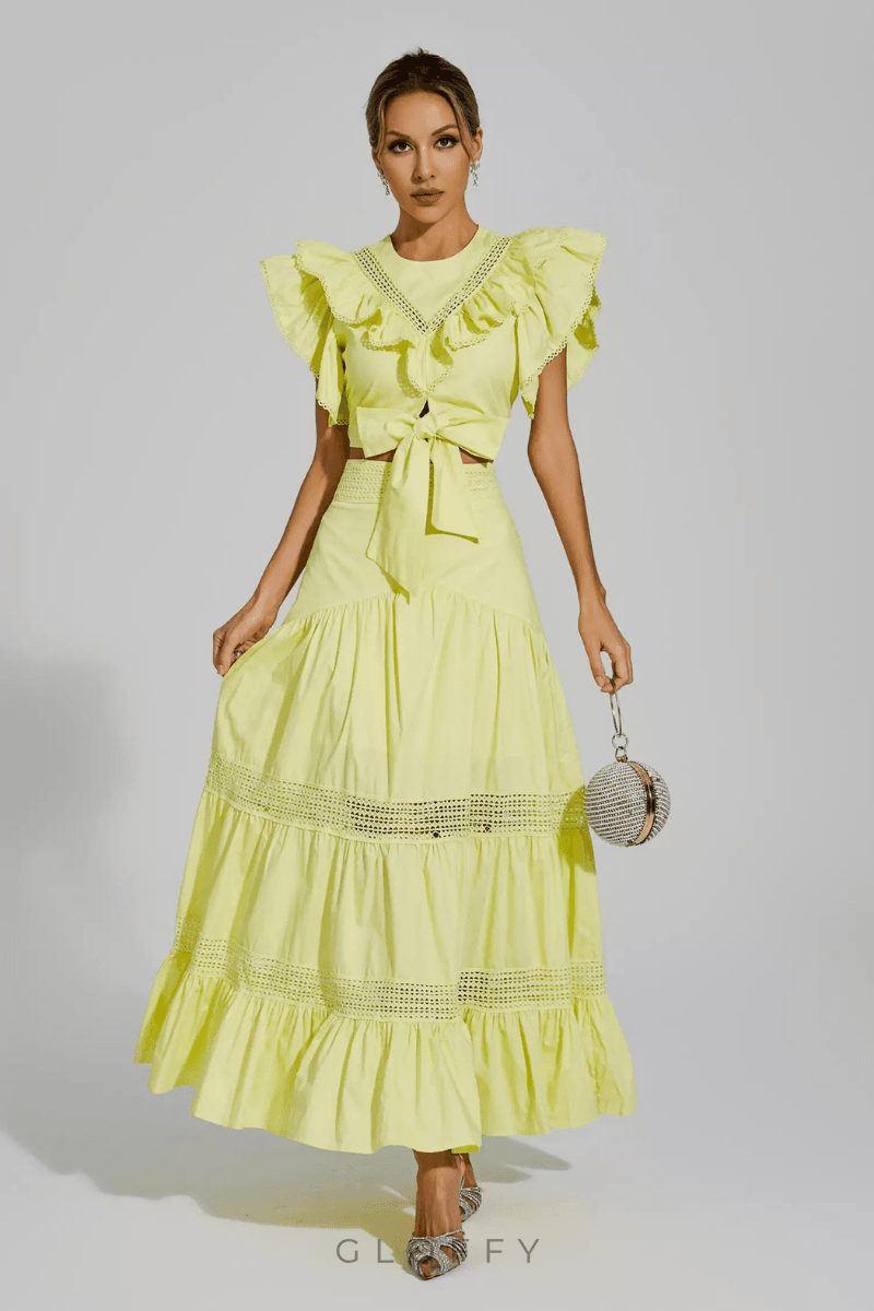Bu sonbahar setinde, yüksek belli dökümlü bir etekle eşleştirilmiş şık, volan kollu bir üst kısım bulunuyor. Zarif kıvrımlı kollar tuhaf bir dokunuş katarken, kravat detayı belinizi güzelleştirerek hoş bir silüet sunar.