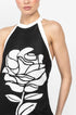 Gül Motifli Boyundan Bağlamalı Midi Elbise ile şıklığı kucaklayın. Şık boyundan bağlamalı tasarıma, kolsuz kesime ve büyüleyici gül motifine sahip bu elbise, açık sırtı ve kontrast detayıyla dikkat çekiyor. Çok esnek trikodan üretilen bu ürün, hoş bir uyum ve üstün konfor sunar.
