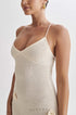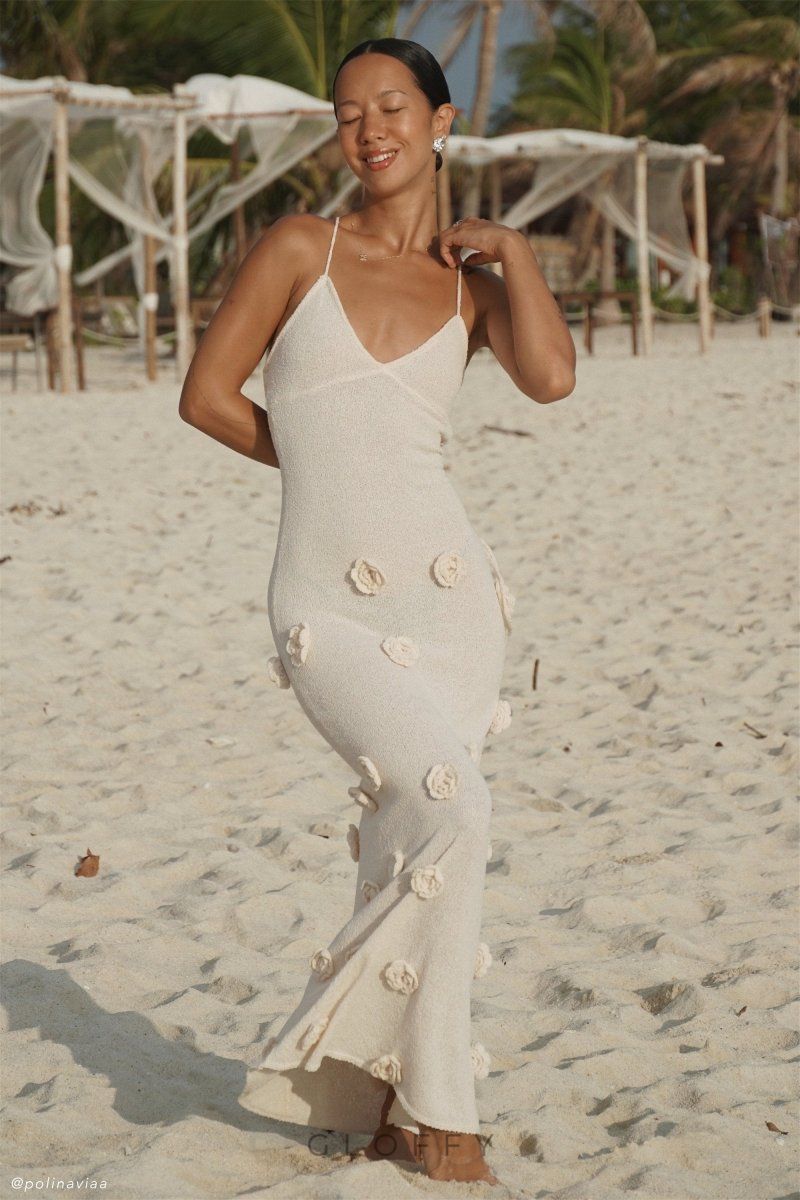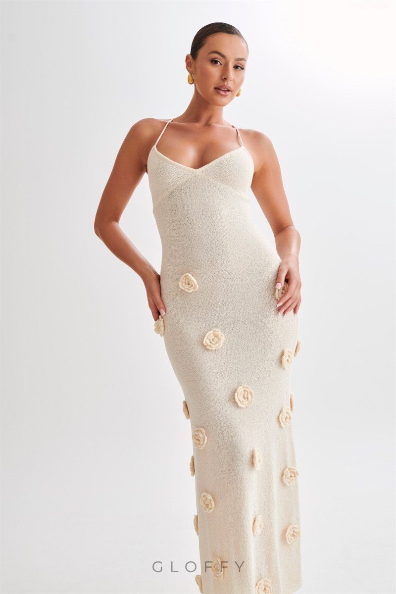 V yakalı ve çapraz fonksiyonel askılara sahip bu çarpıcı bodycon maksi elbiseyle bir etki yaratın. Çiçek aplikesi zarafet katıyor, yüksek esnekliğe sahip triko ise vücudunuza uyum sağlayan hoş bir uyum sağlıyor.