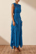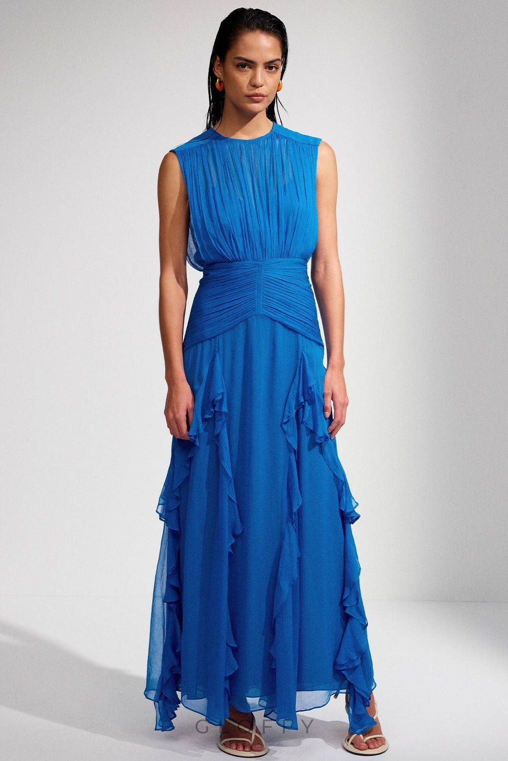 Eileen Pileli Yuvarlak Yaka Volanlı Uzun Elbise
