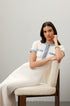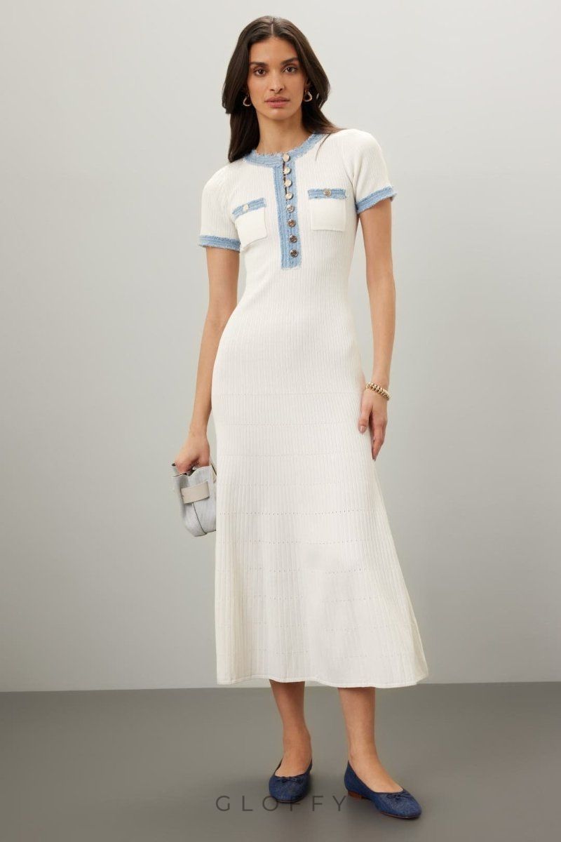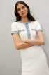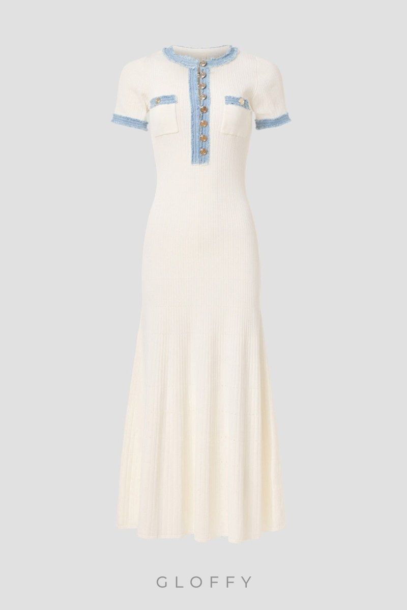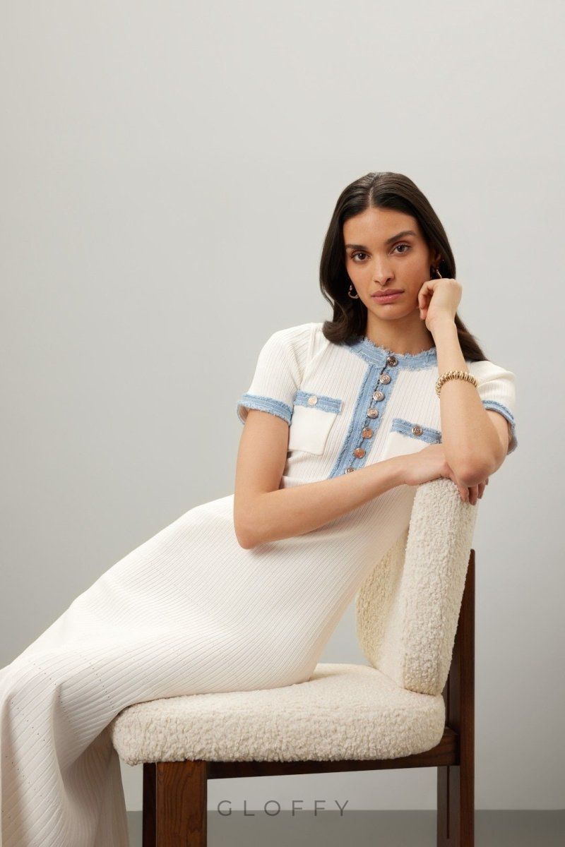Bu bilek boyu örgü elbise, yıpranmış denim şerit ve iki göğüs yama cebiyle klasik yuvarlak yakasına ve kısa kollarına şık bir görünüm katıyor. Kabartmalı düğmeler benzersiz tasarımı güçlendirirken düz etek kısmı modern bir siluet sunar.
