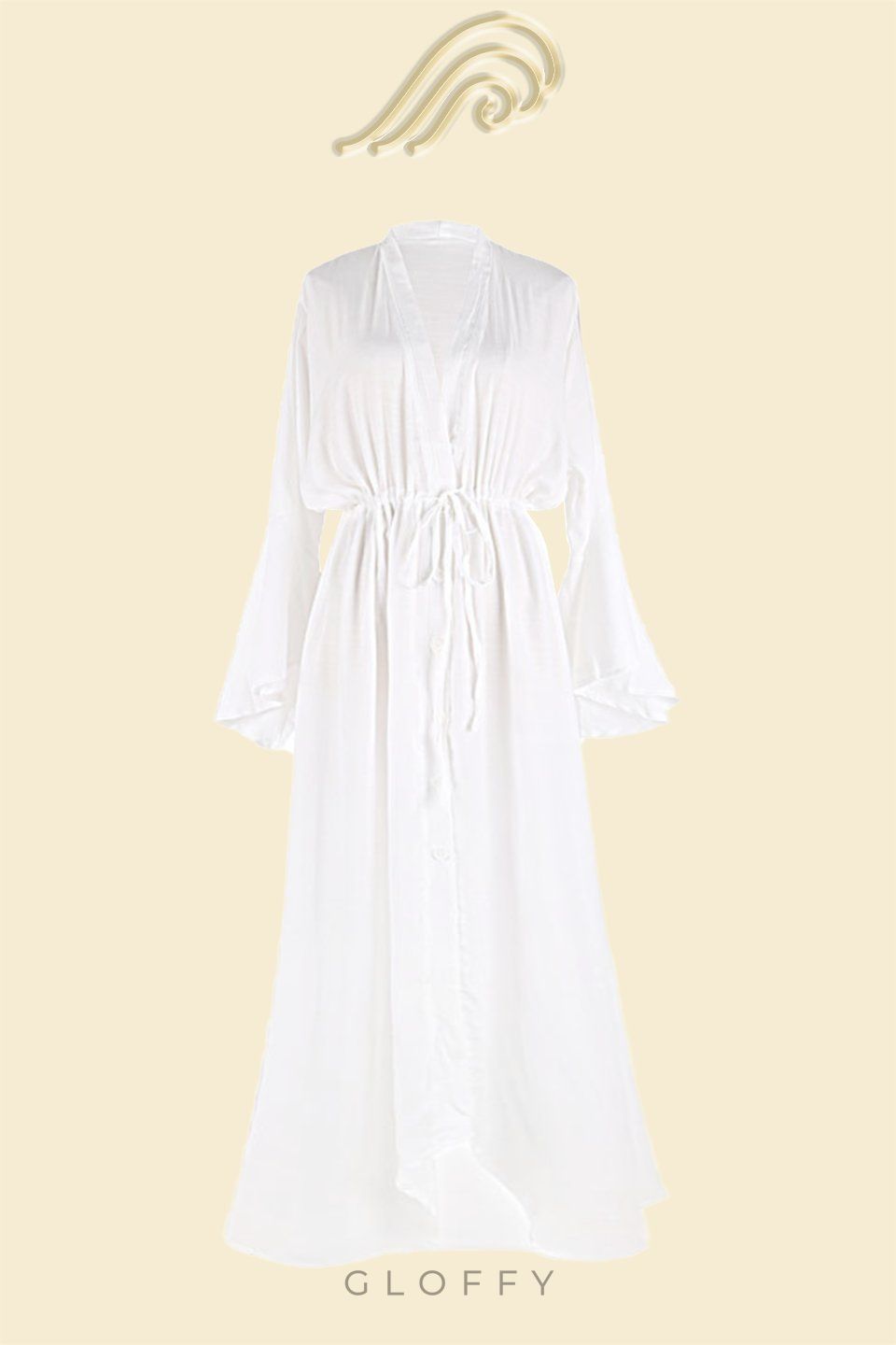 Elvira Düğmeli İpli Maxi Cover-Up ile zahmetsiz şıklığı kucaklayın. Bu çok yönlü parçanın ön kısmı düğmeli ve beli büzmeli olup, plaj kıyafetinize sofistike bir dokunuş katarken uyumu beğeninize göre ayarlamanıza olanak tanır. Akan maksi uzunluk, mayonuzun üzerinde zarif bir örtü sağlar.