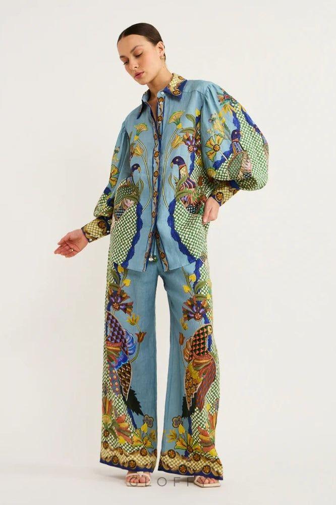 Bu şık sonbahar seti, cesur baskıları ve modaya uygun kabarık kollarıyla tarzınızı ön plana çıkarır. Rahat kesimi konforu zarafetle birleştirirken, ayarlanabilir ipli bel kişiselleştirilebilir bir uyum sağlar. Kabarık kollar, gündelik bir havaya sofistike bir dokunuş katar.