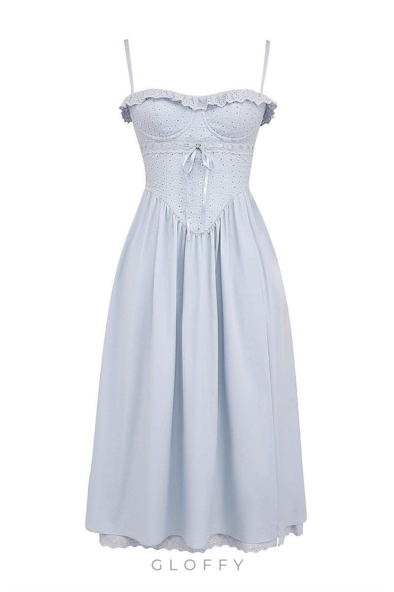 Bu mavi Broderie Anglaise midi elbise, göz kamaştıran kalp şeklinde bir yakaya ve kişiselleştirilmiş bir uyum için ayarlanabilir askılara sahiptir. Yüksek bölünmüş kısım cazibeli bir dokunuş katarken, pamuklu ve işlemeli dantel kumaş konfor ve şıklık sağlar.