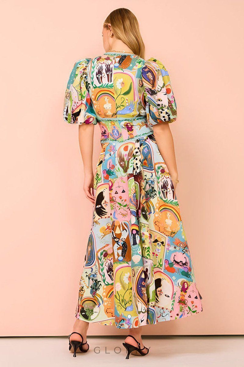 Korseden ilham alan sahte bel ve bedene oturan korsaj detayıyla tasarlanan bu V yaka midi elbise, gardırobunuza sofistike bir dokunuş katıyor. A kesim panelli etek ve hacimli, katlanmış kabarık kollar zarif bir siluet oluştururken, kendinden kaplamalı yerleştirme düğmeleri tasarımı tamamlıyor.