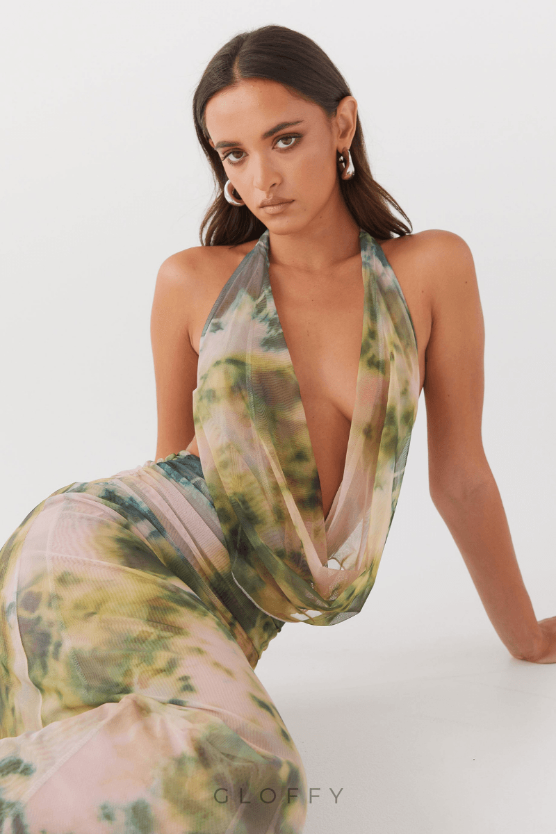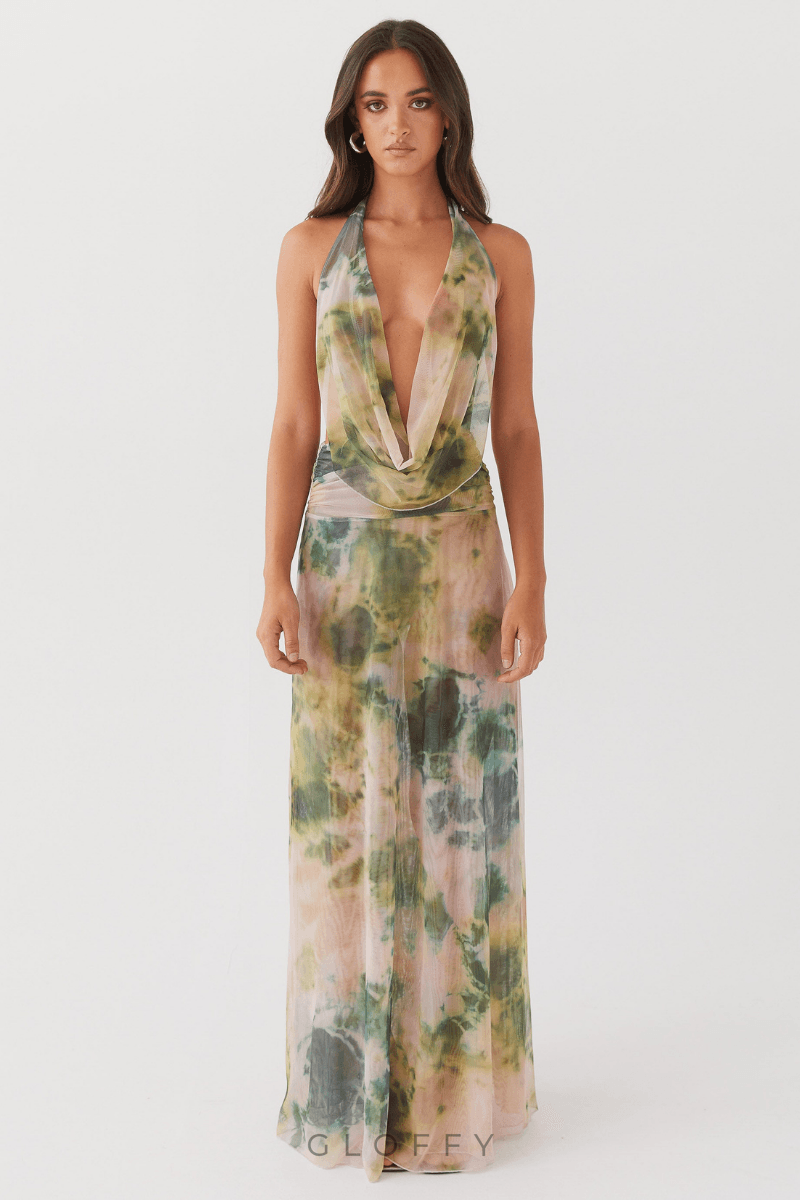 Bu yeni ilkbahar/yaz kadın kıyafeti, göz alıcı mürekkepli yıkama baskısı ve zarafet katan derin V yaka çizgisine sahiptir. Çarpıcı arkası açık tasarım cesur, kadınsı bir tarz sergiliyor, pilili uzun etek ise hareket ve akış yaratıyor.