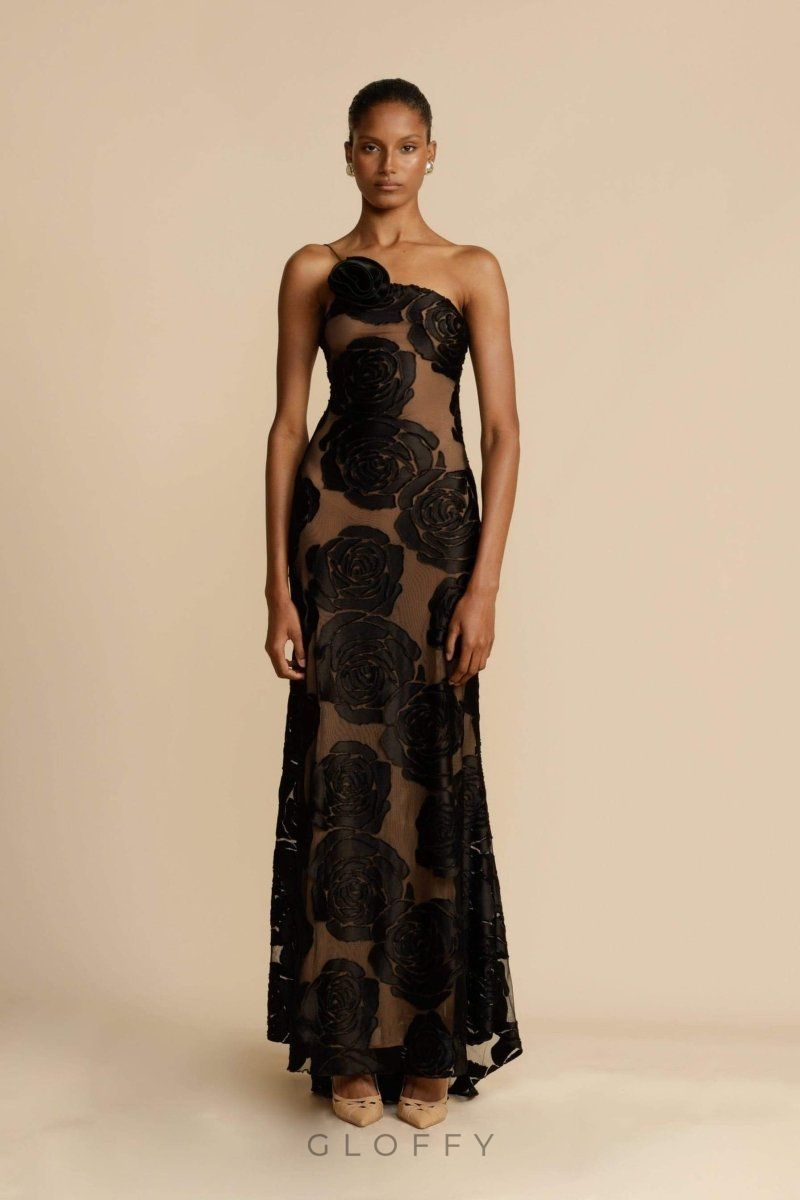 Solmira Tek Omuz Çiçek Aksesuarlı Maxi Elbise