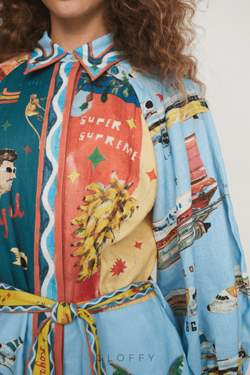 - Tasarım: Baskılı pamuklu keten gömlek ve şorttan oluşan iki parçalı set