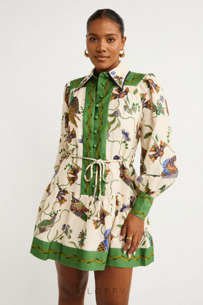 Bu sanatsal elbise, benzersiz bir grafiti baskısı ve tek sıra düğmeli tasarımıyla modern tarzı eğlenceli ayrıntılarla harmanlıyor. Uzun fener kolları hacim ve zarafet katarken, bel kravatı göz kamaştırıcı, sıkı bir siluet yaratıyor.