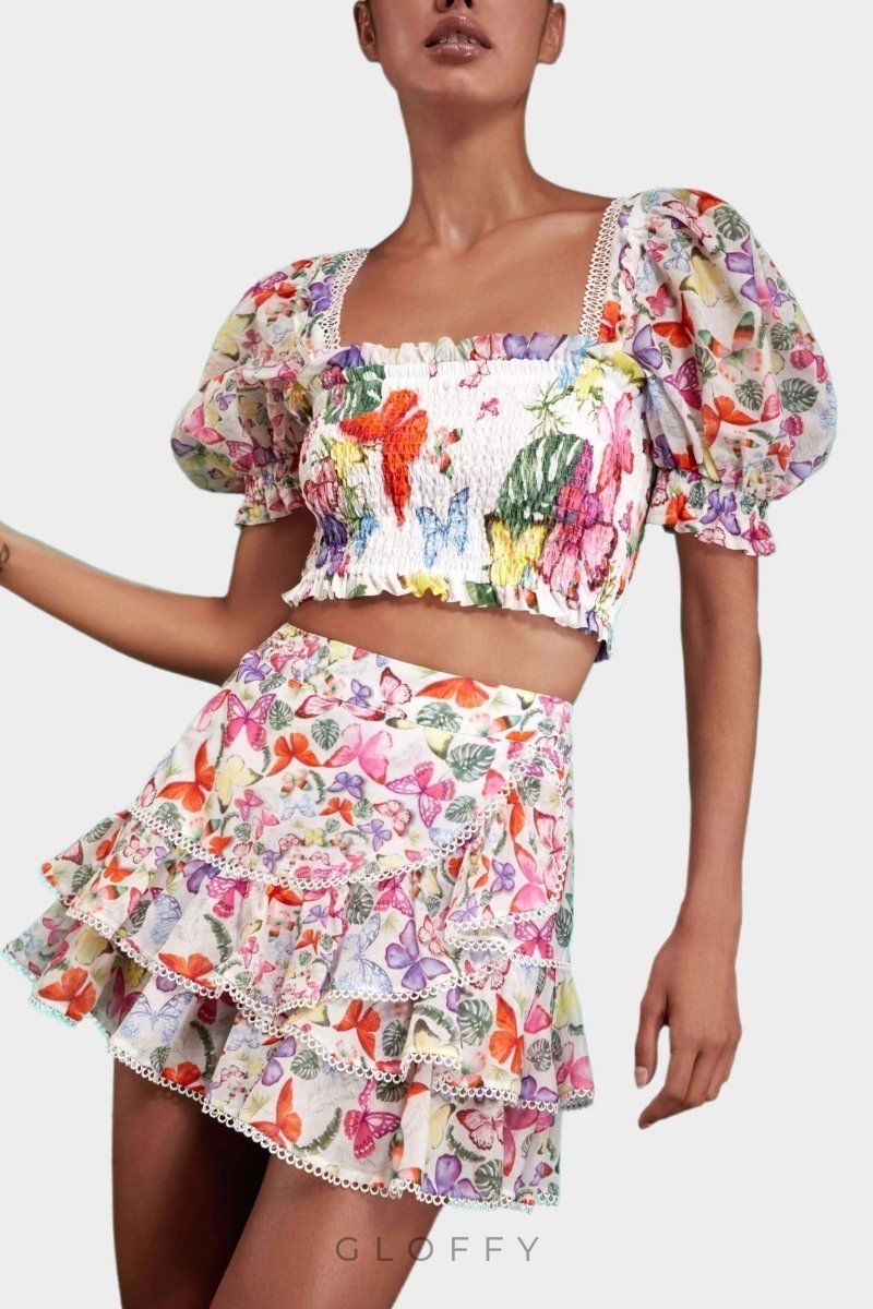 Bu çarpıcı parça, geometrik güpürlerle süslenmiş asimetrik fırfırlara ve elle boyanmış baskı elemanlarına sahip olup benzersiz ve göz alıcı bir tasarım yaratıyor. Kare yaka ve kısa kabarık kollar vintage bir çekicilik katıyor, büzgülü panel ve büzgülü detaylar ise yüksek esnekliğe sahip hoş bir uyum sağlıyor.