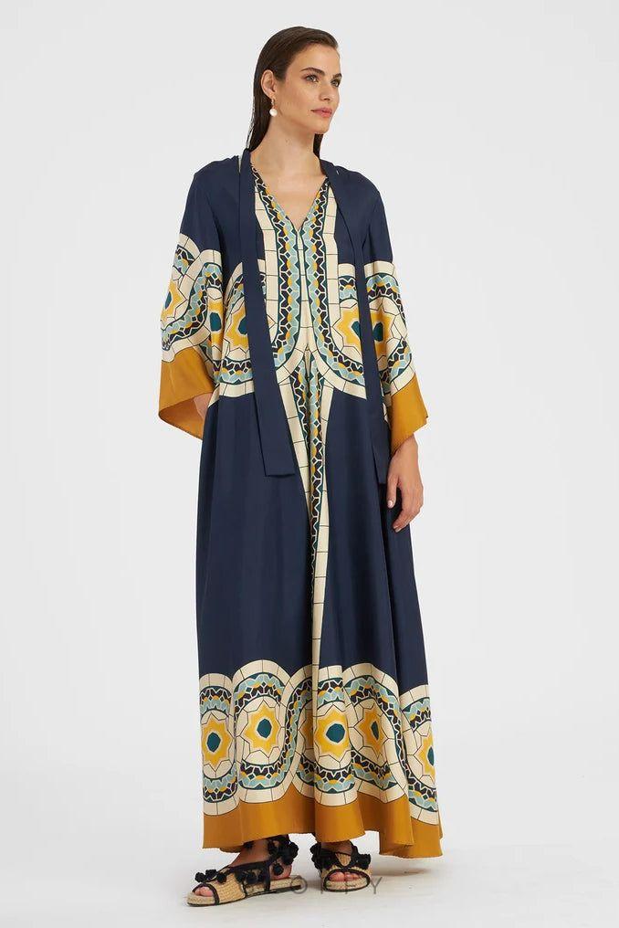 Bu zarif tasarımlı elbise, yüksek yaka, dramatik arkadan bağlamalı kuşak ve dökümlü şelale kolluyla en özel günler için şıklığı temsil ediyor. Çöken saray partileri için mükemmel olan bu parça, hem eklektik hem de cesur stil uzmanları için zahmetsiz bir seçimdir.