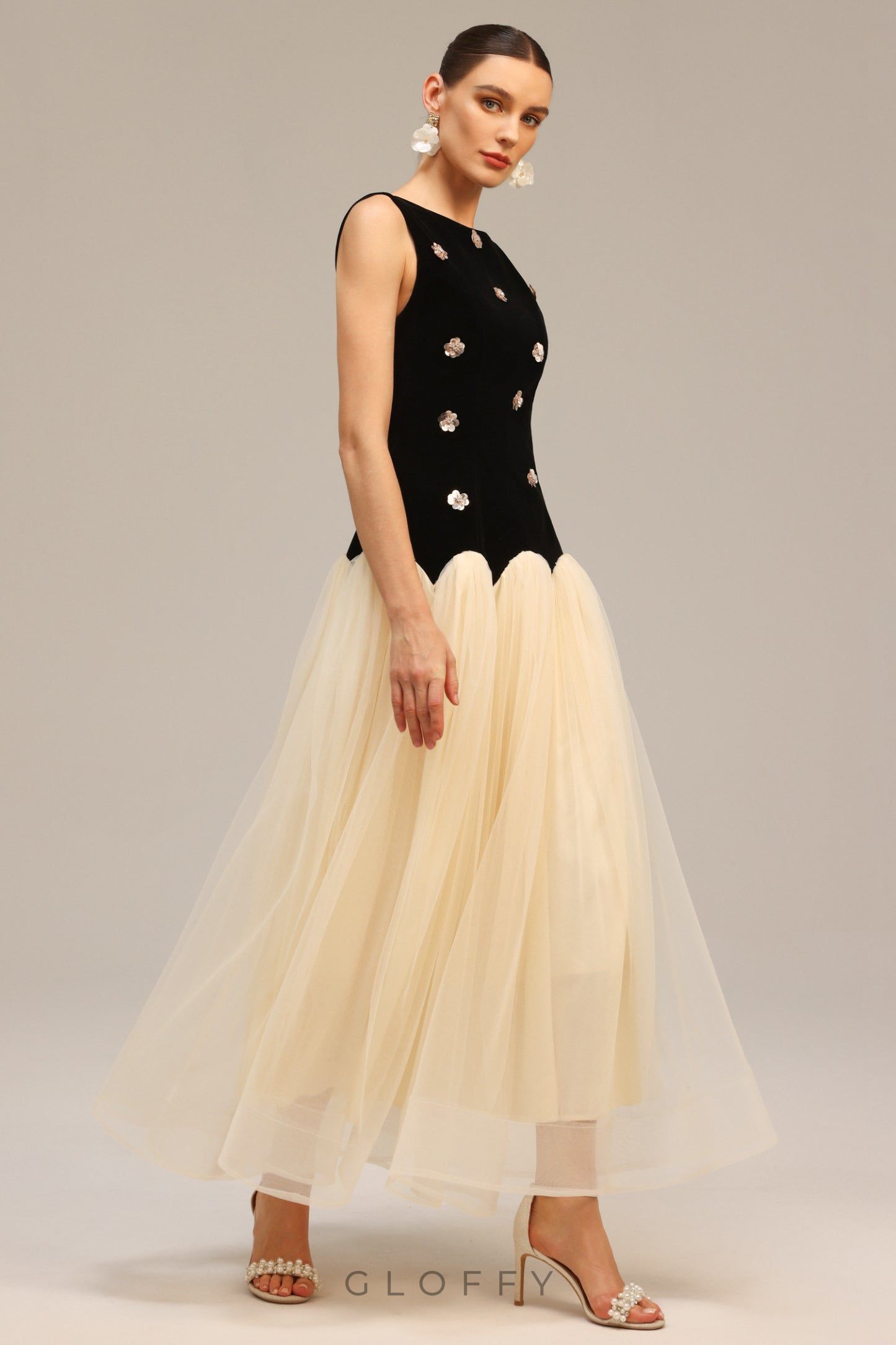 Vivianne Işıltılı Çiçek Detaylı Kolsuz Maxi Elbise