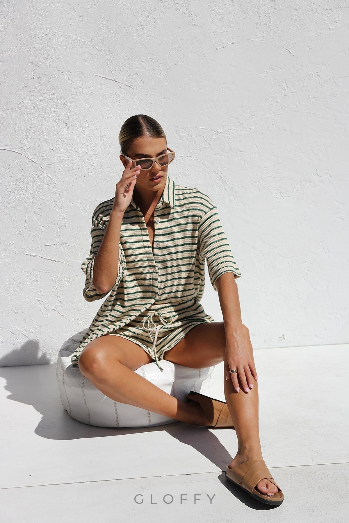 Canlı yeşil şerit baskıyla süslenmiş şık bej tabana sahip hafif örgü iki parçalı setimizle gündelik gardırobunuzu yükseltin. Rahat kesimli, yakalı, düğmeli üst, astarsız ve yarı şeffaf olup, havadar ve zahmetsiz bir görünüm sunar.