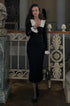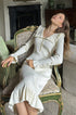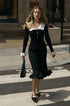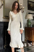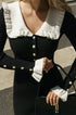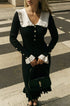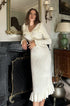 Amara Sicilya Fırfır Detaylı Örgü Midi Elbise, zarafeti ve konforu bir araya getiriyor. Bu diz boyu elbise, büyüleyici Peter Pan yakası ve geniş fırfırlı etek detaylarıyla dikkat çekiyor. V yakalı tasarımı ve suni inci düğmeleri, vücuda oturan siluetine şıklık katıyor.