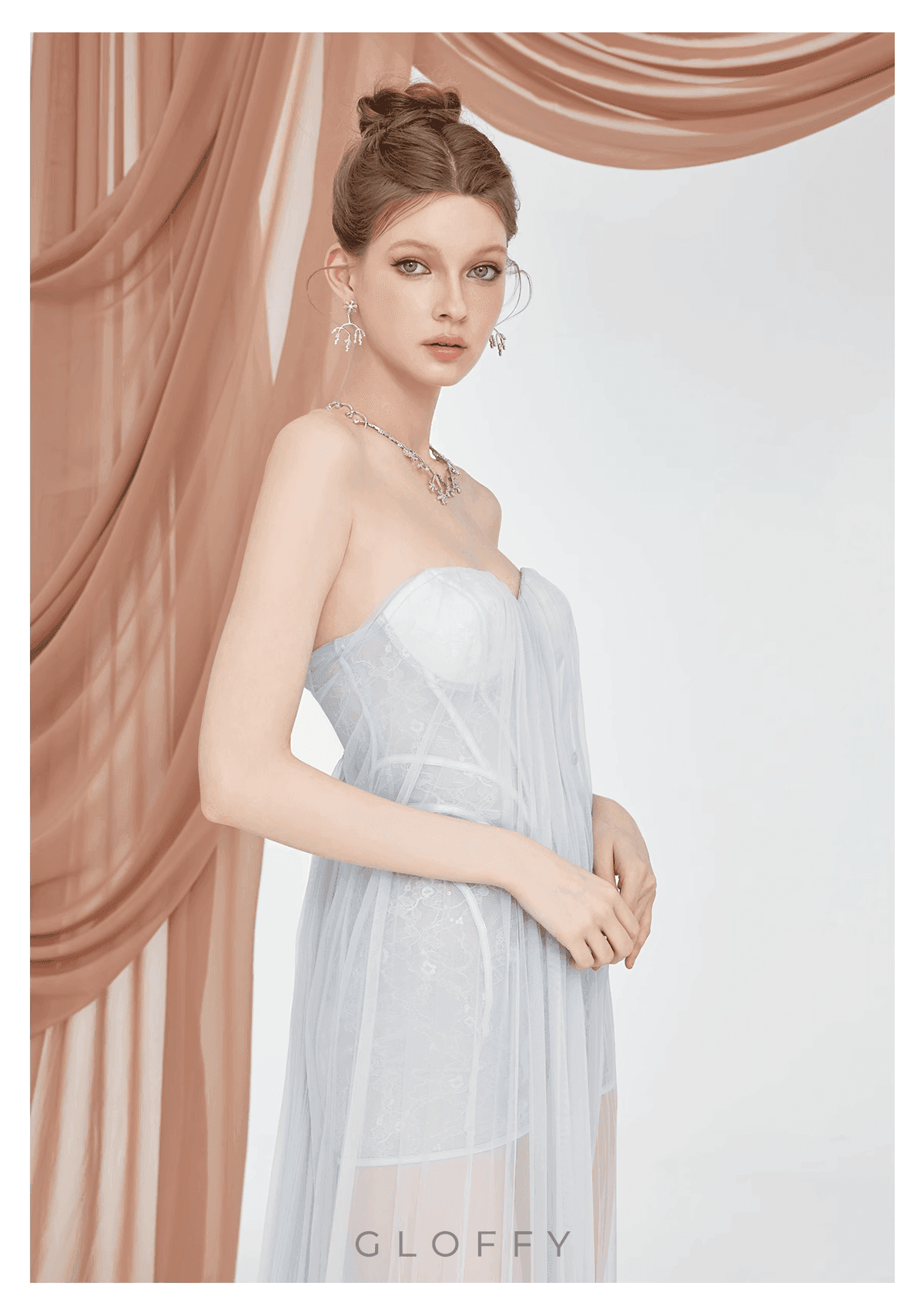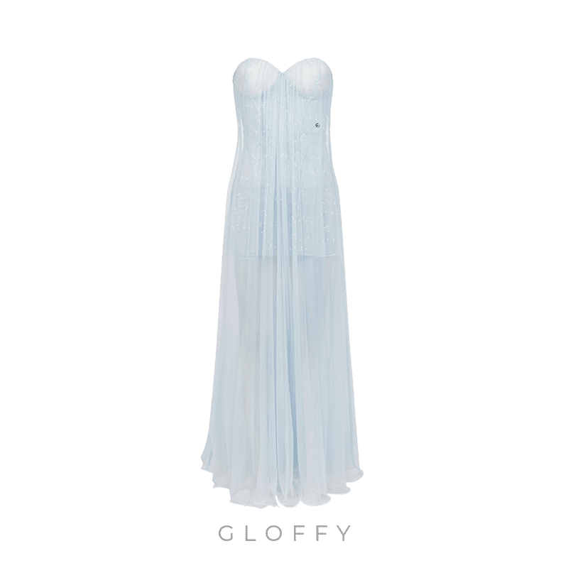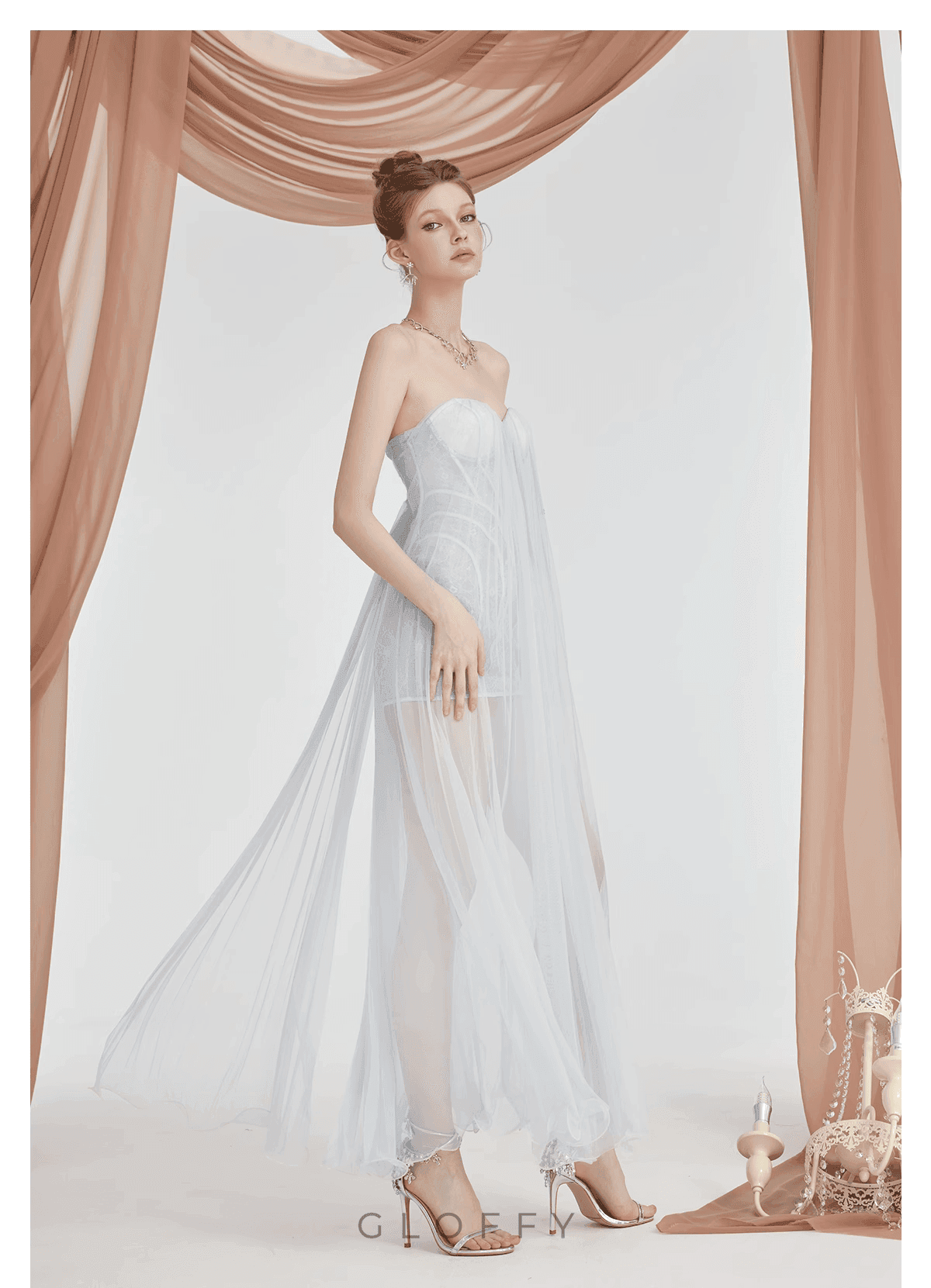 Zarif silüeti ve akışkan tül kumaşı ile büyüleyici bir görünüm sunar. Kalp yaka tasarımı ve hafif drapeli korsajı, vücuda mükemmel bir uyum sağlar. Uzun, yere kadar uzanan etek kısmı hareket ettikçe akışkan bir etki yaratarak sofistike bir duruş kazandırır.