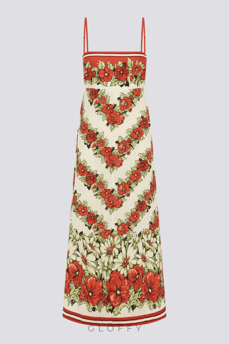 - Tasarım: Bitki temalı baskılı, ince askılı, yüksek belli elbise