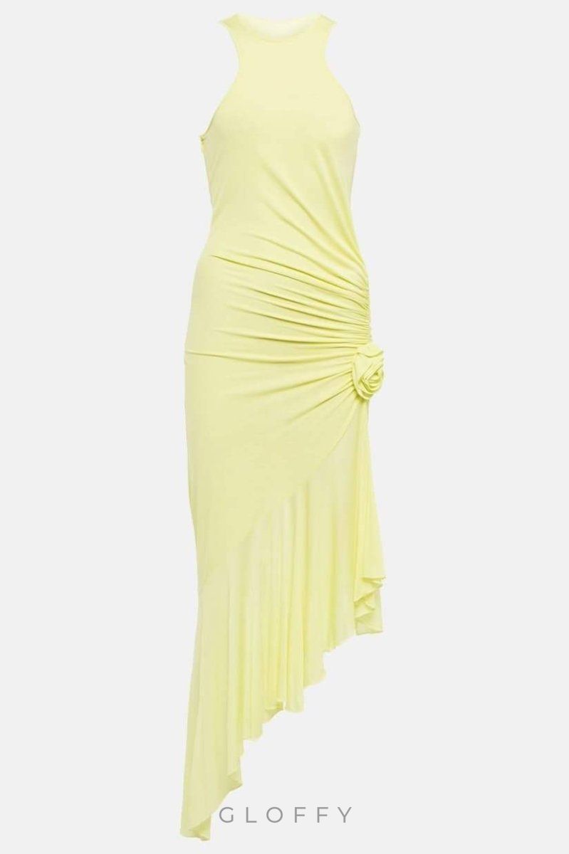 Velimora Asimetrik Pliseli Halter Yaka Yırtmaçlı Midi Elbise