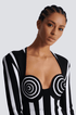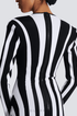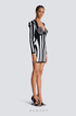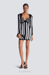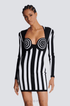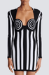 Bu seksi, dekolteli, siyah beyaz çizgili bandaj mini elbise, her partide dikkatleri üzerine çekecek şekilde tasarlanmıştır. Cesur çizgiler ve vücudu saran kesim çarpıcı ve modern bir görünüm yaratırken, derin yaka ekstra bir çekicilik katıyor.