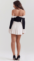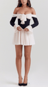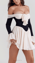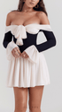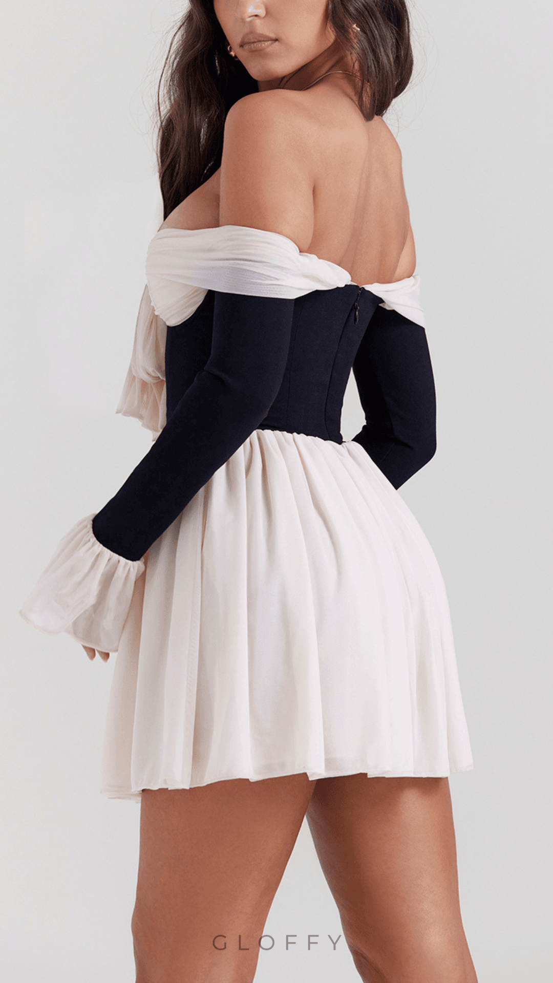 Bu dikkat çekici mini elbise, özel günlerde şıklığınızı tamamlamak için mükemmel bir seçimdir. Korse detayları vücudu kusursuz bir şekilde sararken, büyük fiyonk detayı omuzları açıkta bırakan zarif tasarımıyla öne çıkıyor. Uzun, yivli kollar ve dalgalı eteği, hareketli ve etkileyici bir siluet yaratıyor.
