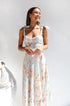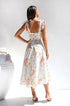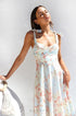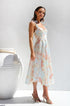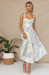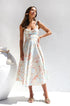 Bu zarif elbise, kalp yakalı ve kıvrımlı göğüs tasarımıyla büyüleyici bir soyut çiçek baskısına sahiptir. Papyon askıları ve şekillendirilmiş korsajı, kadınsı çekiciliği artırırken geniş etek kısmı eğlenceli bir dokunuş katar.