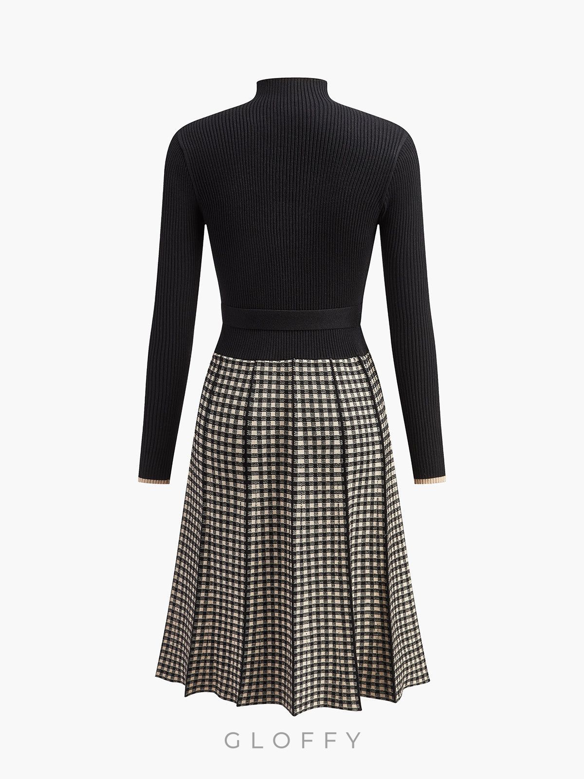 Şık Ekose Kazak Elbisesi Şık Kemerli Tasarım ile