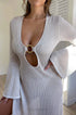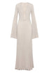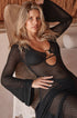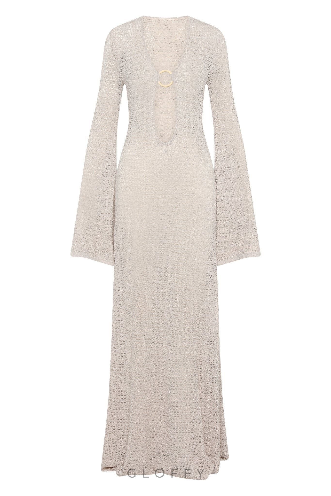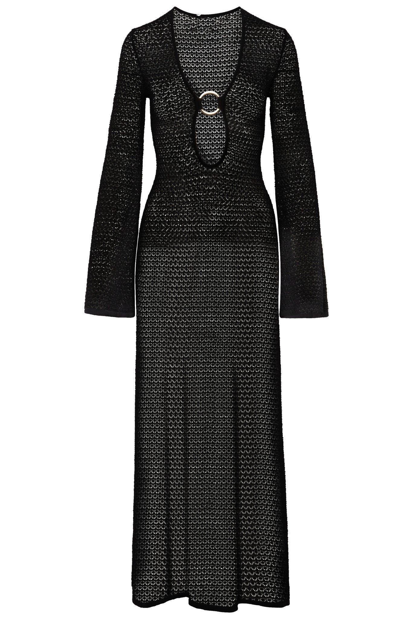 Yere kadar uzanan bu elbise, metal halka süslemeli V yakaya ve modern bir dokunuş katan cesur bir kesim tasarımına sahiptir. Tığ işi trikolardan üretilen bu ürün, transparan detayları ve çan kollarıyla benzersiz ve zarif bir görünüm yaratıyor. Yüksek esnekliğe sahip kumaş, mükemmel bir uyum ve rahat bir kullanım sağlar.