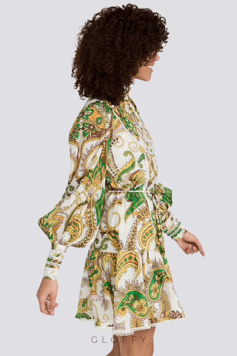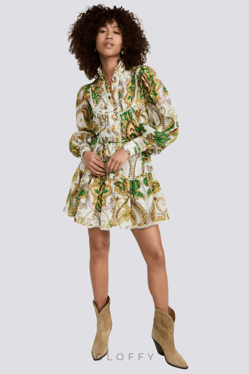 - Tasarım: Benzersiz baskı ve kravat detaylı, yüksek yakalı gömlek elbise