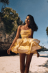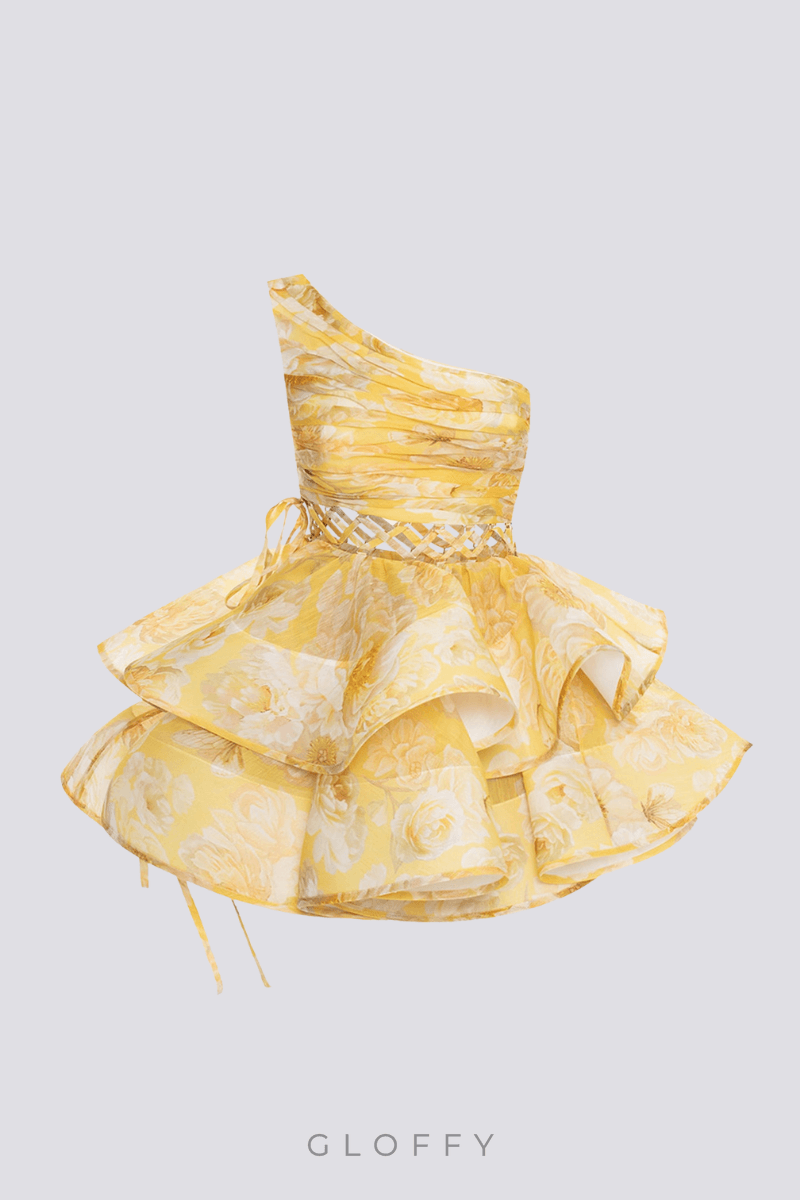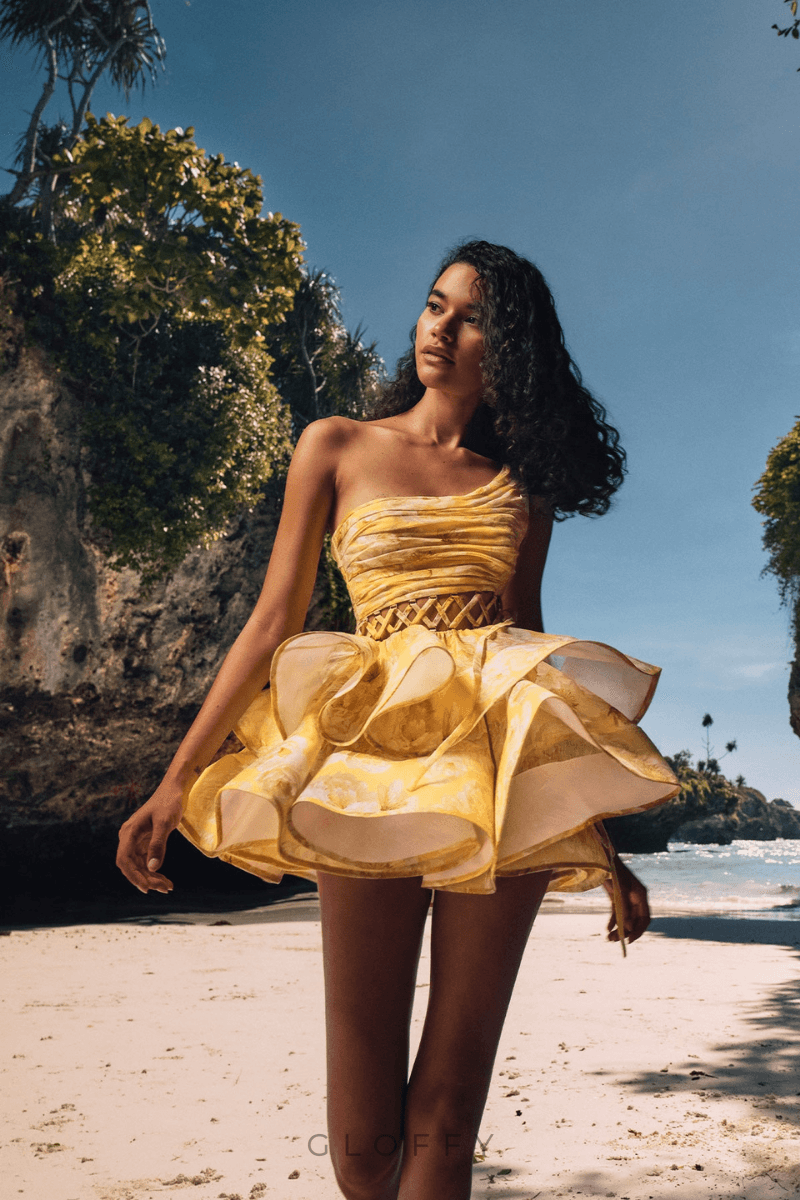 Cora Tek Omuzlu Fırfırlı Kesim Mini Elbise Sarı