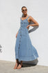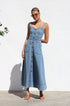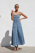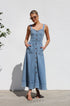 Gardırobunuzu bu şık orta mavi kot midi elbiseyle güncelleyin. Zamana meydan okuyan bir görünüm için ayarlanabilir kalın askılara ve göz alıcı kalp yakaya sahiptir. Ön kısımda uzanan suni düğme detayı klasik bir çekicilik katarken, ön cepler pratik işlevsellik sunar.