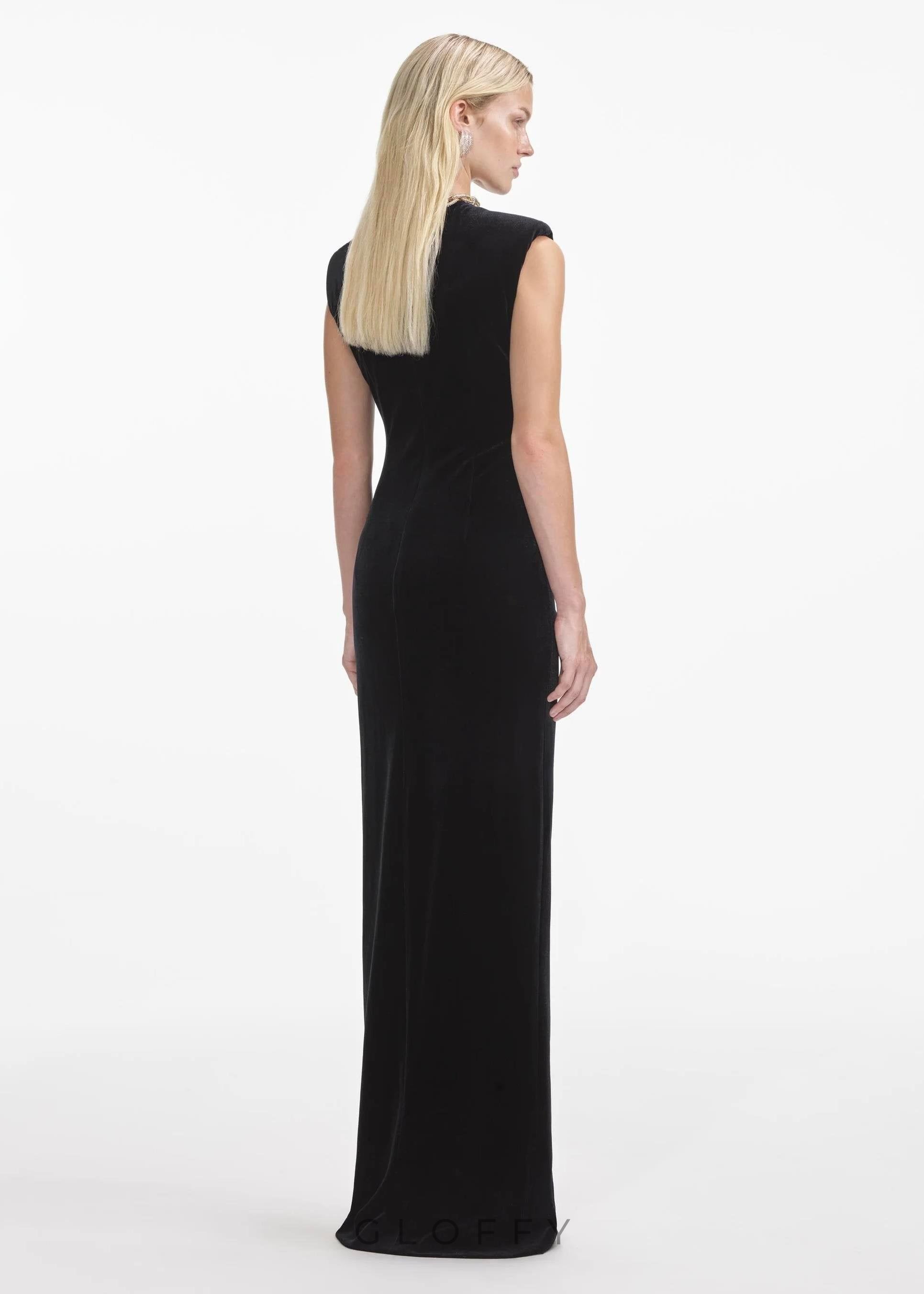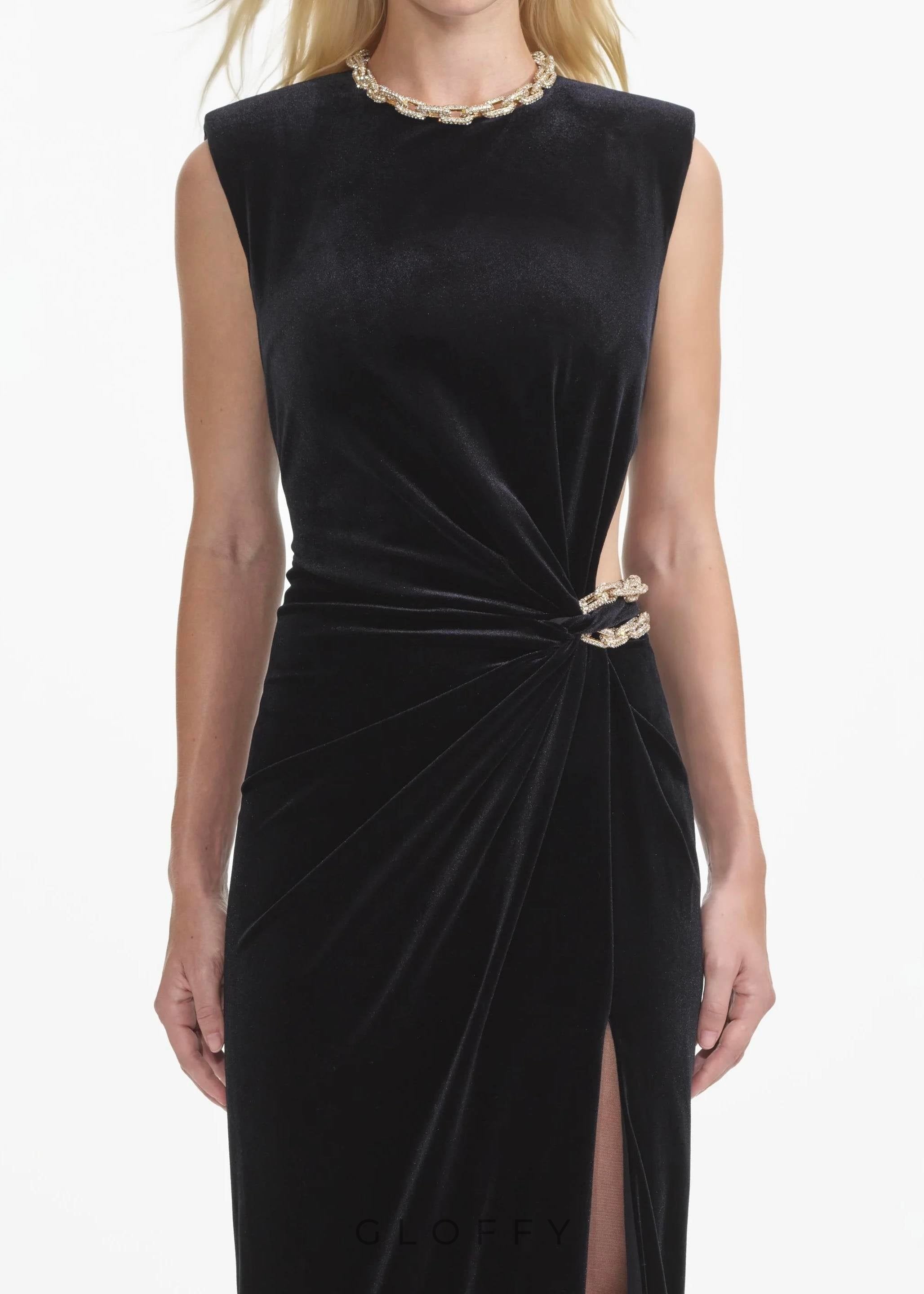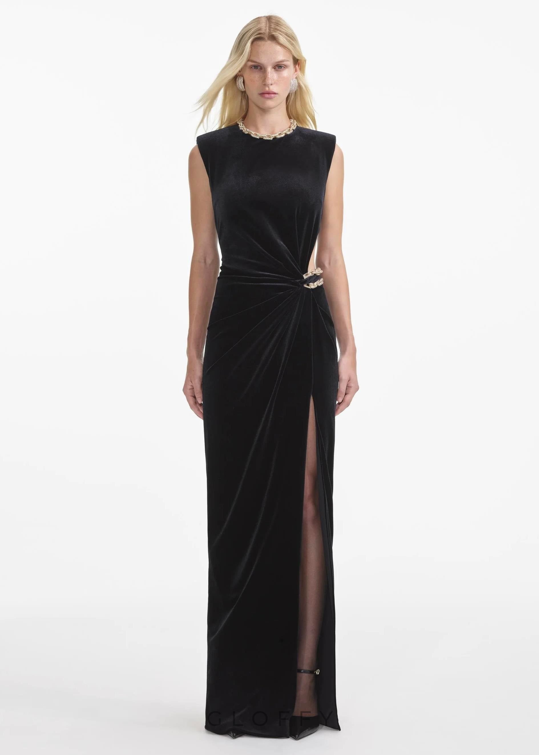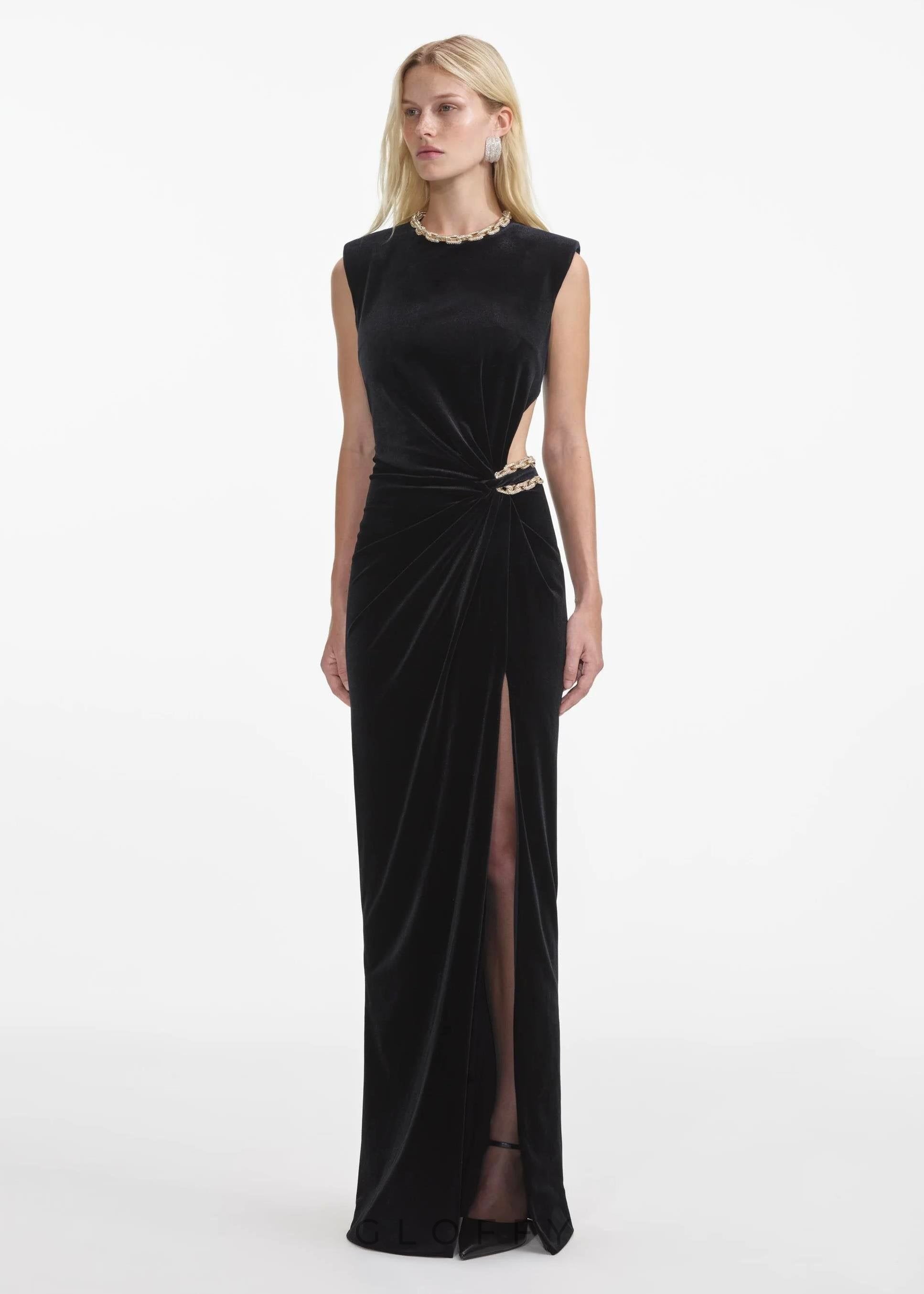 Noémie Zincir Detaylı Yırtmaçlı Kadife Maxi Elbise