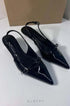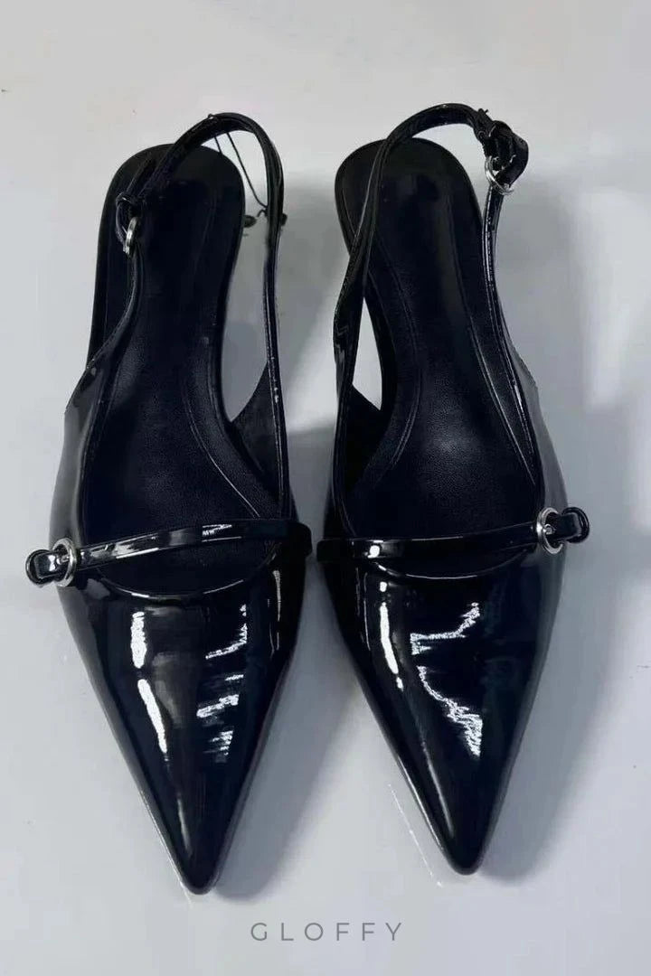 Arkası açık topuklu ayakkabılar. Önü toka detaylı. Sivri burunlu. Ayarlanabilir arka askılı.
