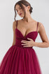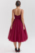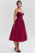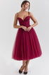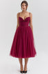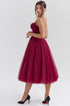 Büyüleyici bordo rengi ve zarif tül katmanlarıyla dikkat çeken bu midi elbise, feminen ve şık bir silüet sunuyor. Üst kısmındaki büzgü detayı ve vücuda oturan korsaj yapısı, elbiseye sofistike bir hava katarken, bel kısmındaki ince şerit detayı zarif bir dokunuş ekliyor. Hareket ettikçe hacimli bir görünüm sunan tül eteği, romantik bir stil oluşturuyor.