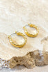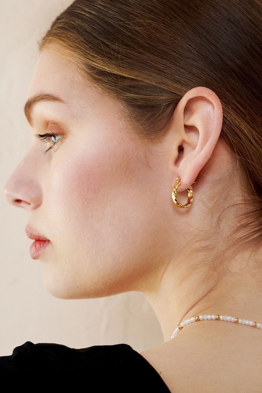 Pirinç ana metal üzerine 18K altın kaplamaya sahip bu bükümlü halka küpelerle zarif bir dokunuş katın. Tasarım, uzun süreli parlaklık ve dayanıklılık sağlamak için kararmaya karşı koruyucu bir katmanla kaplanmıştır.