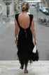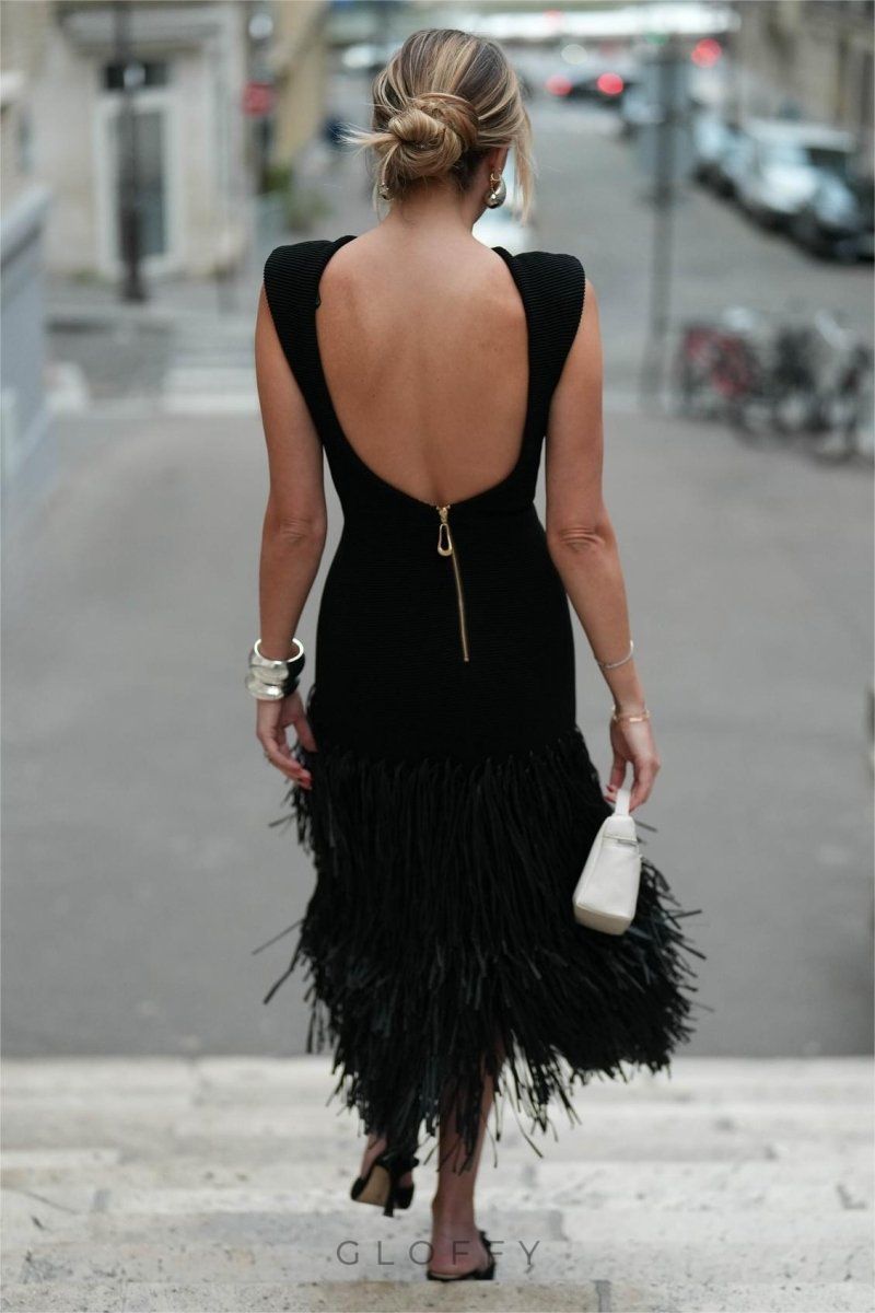 Bu midi elbise, şık, sırtı açık bir tasarıma ve eğlenceli bir dokunuş için eğlenceli püsküllere sahiptir. Orta esnekliğe sahip, vücuda oturan örgü polyesterden üretilen bu ürün, hoş bir siluet ve rahat bir uyum sunar.