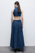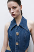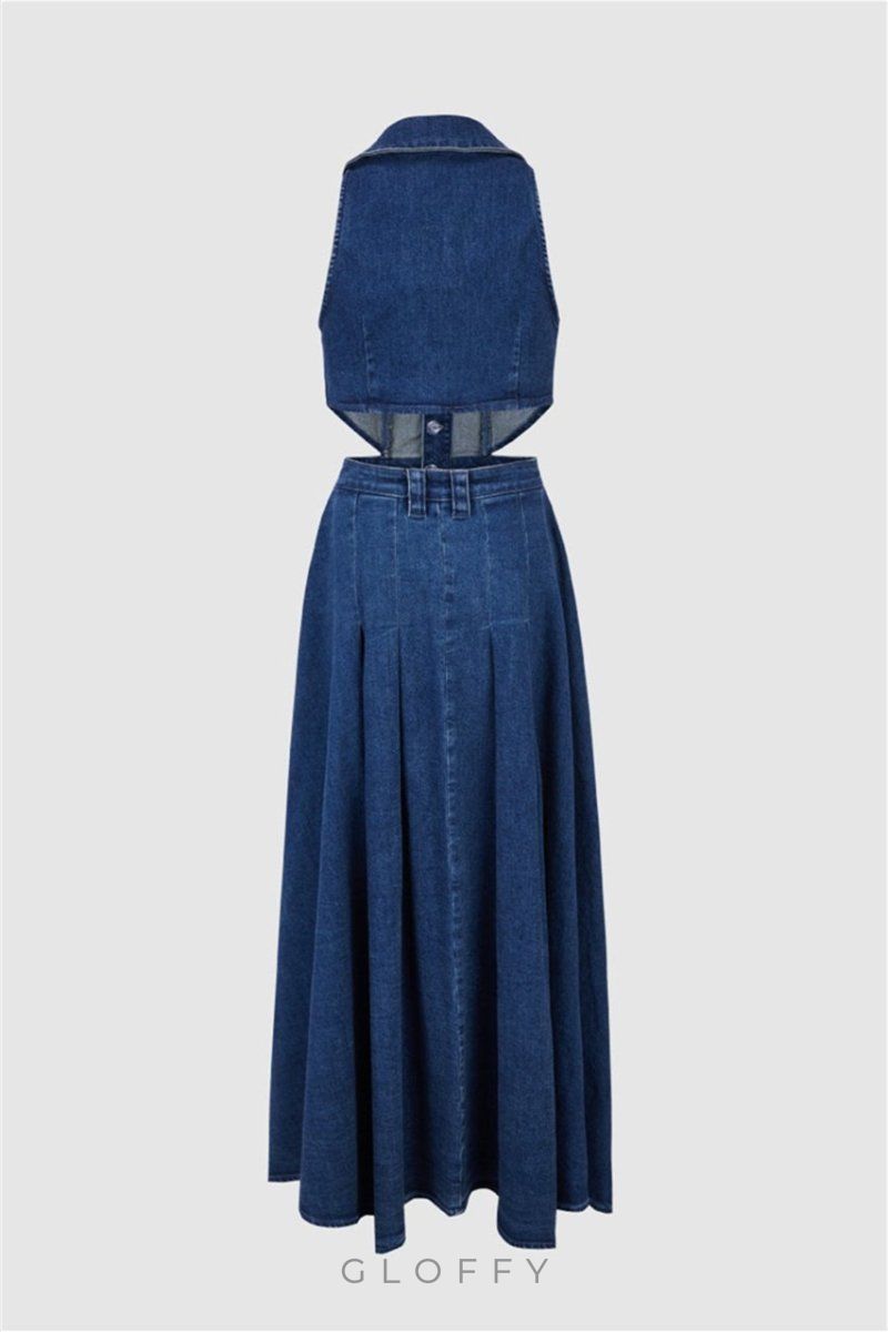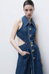 Kolsuz Denim Mini Elbisemizle cesur bir moda ifadesi yaratın. Çarpıcı metal tokalara ve oyuk tasarıma sahip bu elbise, sıra dışı stili klasik denimle birleştiriyor. Yaka yakası, mini uzunluktaki siluete sofistike bir dokunuş katıyor.