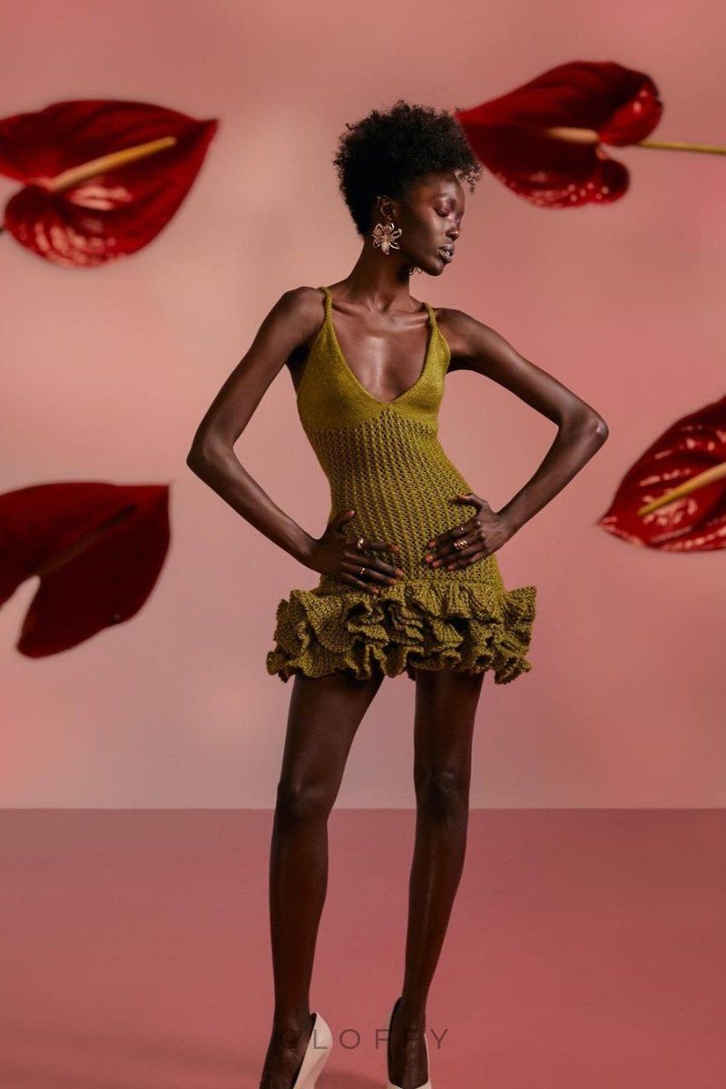 Göz alıcı V yakalı ve kolsuz tasarıma sahip Tığ işi Fırfırlı Mini Elbise ile zahmetsiz tarzı benimseyin. Bu elbise, görünümünüze ilginç bir dokunuş katan zarif tığ işi detaylar ve eğlenceli fırfır vurgularıyla süslenmiştir.