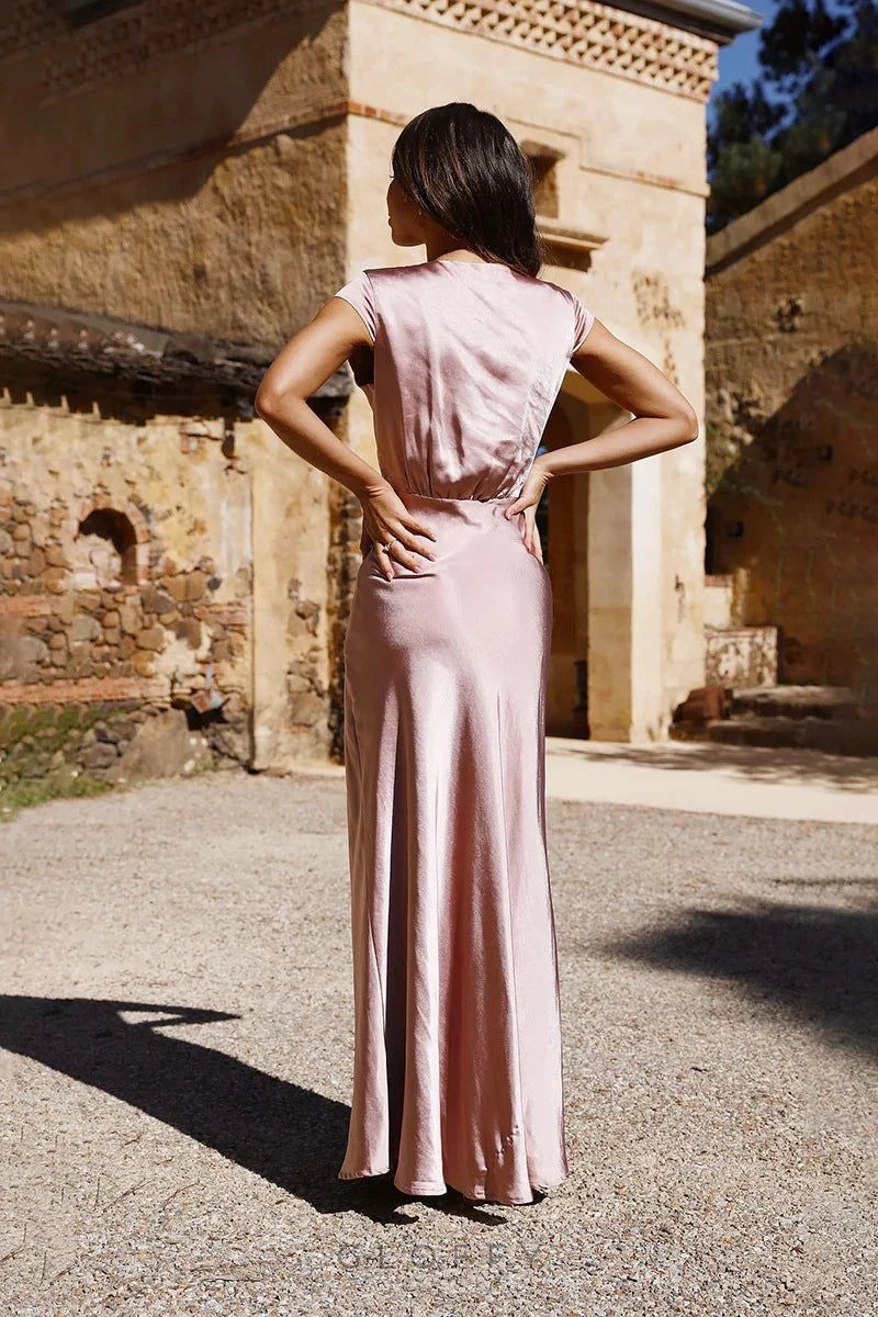 - Tasarım: Saten, düz renk, V yakalı, seksi balık etekli siluet