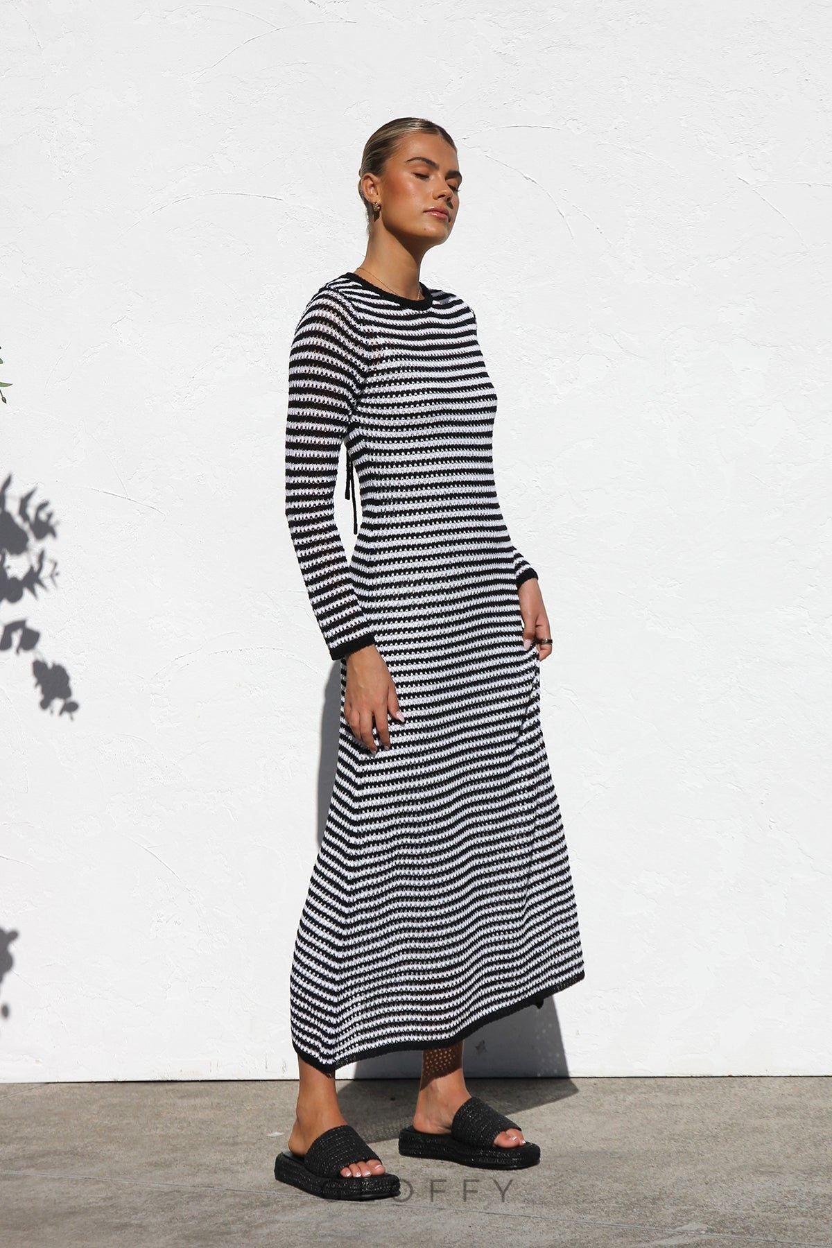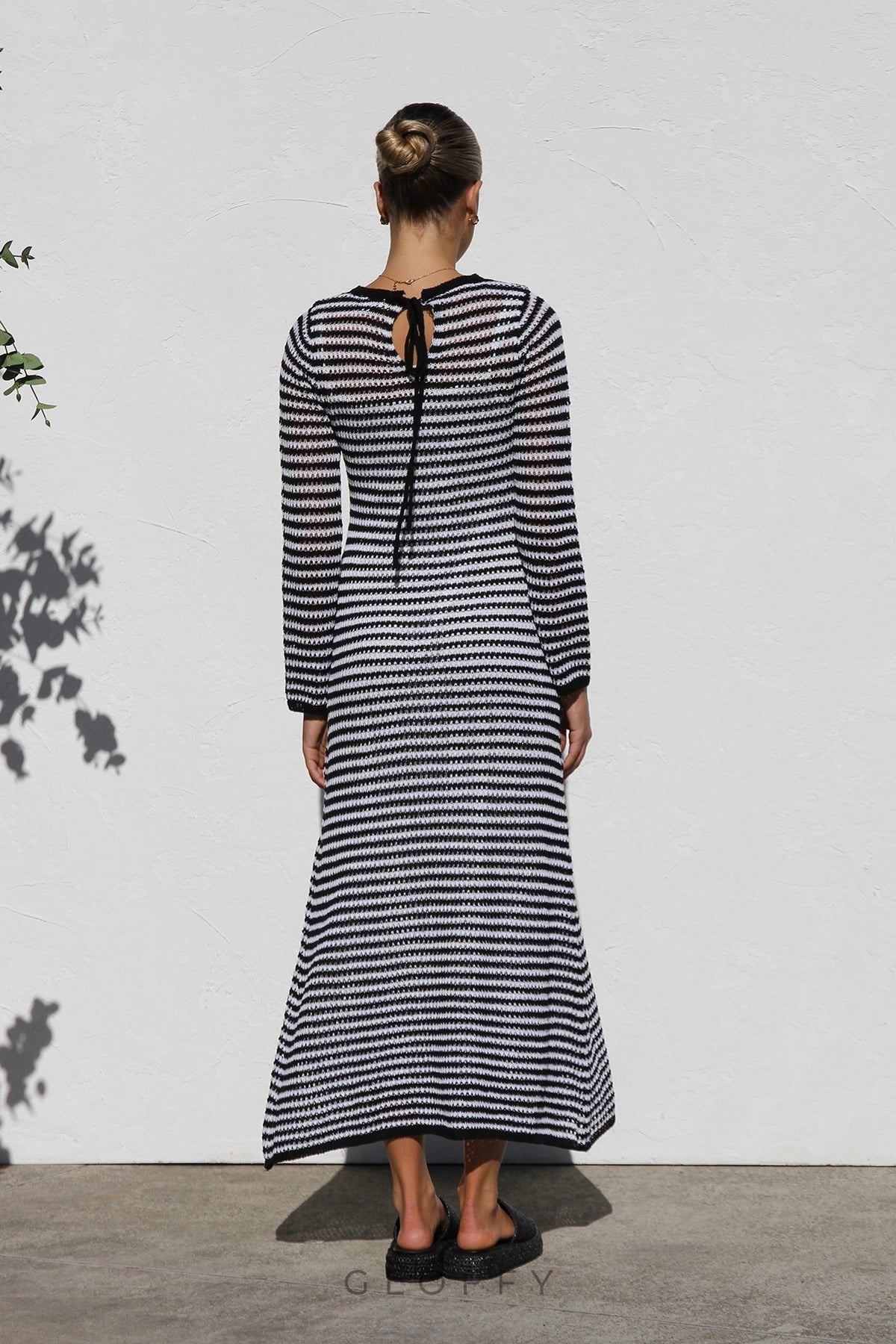 Modern, havadar bir his için hafif, açık dokuma örgü kumaştan üretilen, çarpıcı siyah beyaz çizgili Seraphina Elbiseyi keşfedin. Elbise, kendinden bağlamalı yuvarlak yakalı ve uzun kollu olup, klasik şıklığı çağdaş tasarımla harmanlamaktadır.
