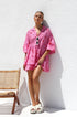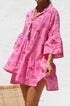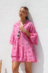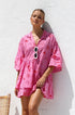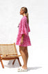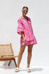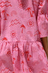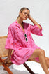 Büyük beden kesime ve pembe zemin üzerine koyu kırmızı baskıya sahip önlük tarzı elbisemizle zahmetsiz stili deneyimleyin. Hafifçe genişleyen orta uzunlukta bir kolla tasarlanan bu elbise, konforu bir incelik dokunuşuyla birleştiriyor. Fonksiyonel düğmeli ön kısım çok yönlülük katarken, asimetrik, katmanlı ve katlı etek dinamik ve hoş bir siluet yaratıyor.