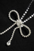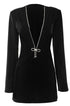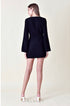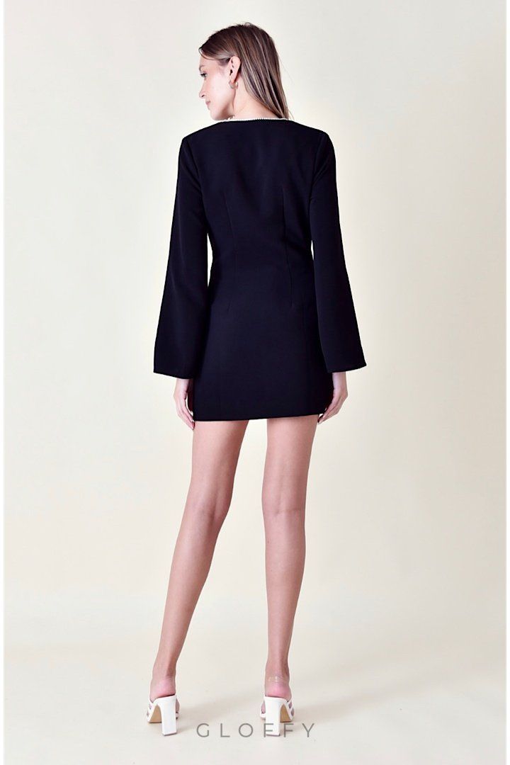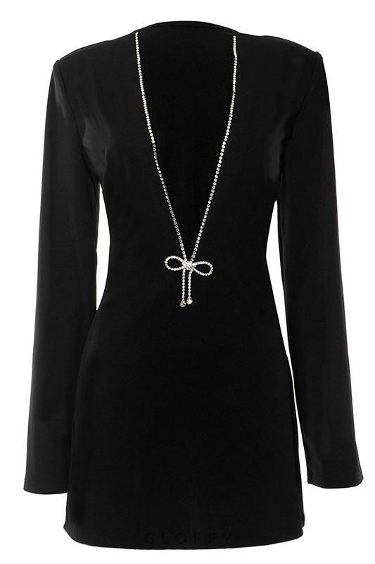 Diamante V Yaka Mini Elbisemizle görünümünüzü yükseltin. Bu elbise, göz kamaştırıcı bir dokunuş katan, ışıltılı elmas detaylarla süslenmiş çarpıcı bir V yakaya sahiptir. Zil kolları ve papyon detayı şık ve sofistike havasını artırıyor.