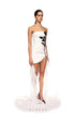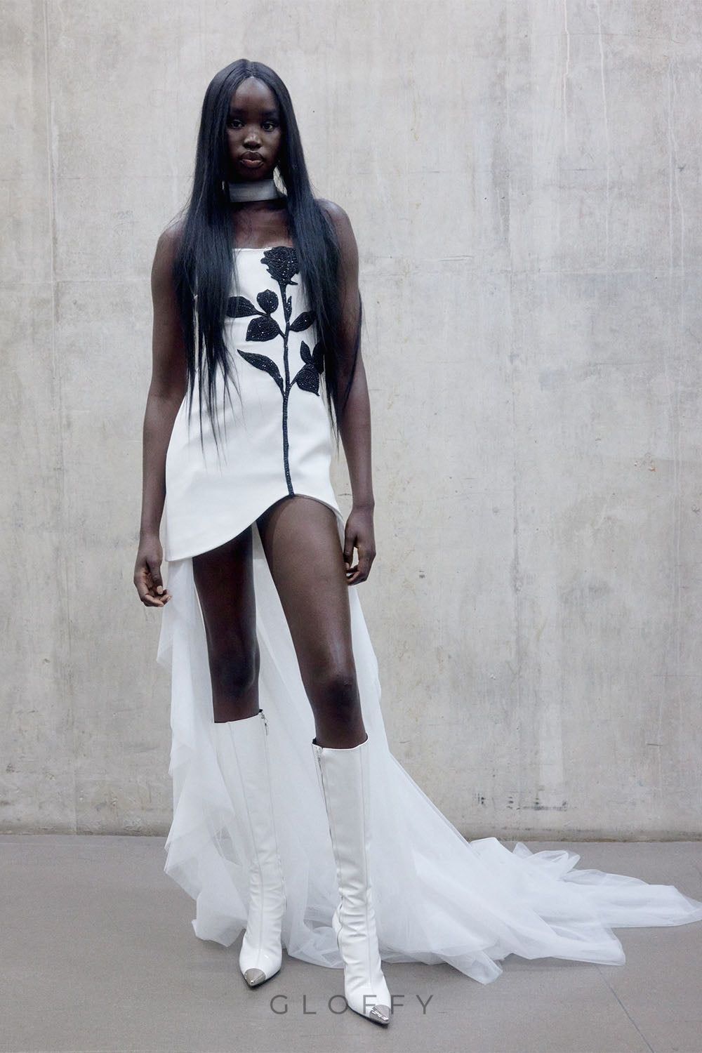 Bu mini elbise, askısız kesim ve büyüleyici kristal çiçek desenli süslemelerle çarpıcı asimetrik bir tasarıma sahiptir. Tülle kaplı kuyruk dramatik bir zarafet katarken, kontrast oluşturan süslemeler şıklığını artırıyor.