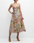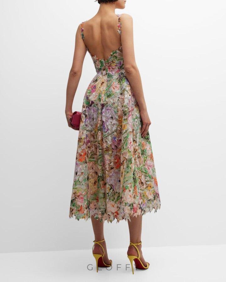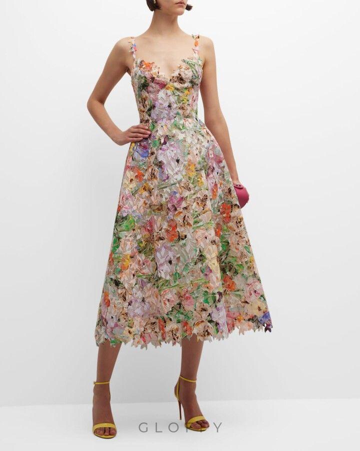 Bu diz altı slip elbise, çiçek desenli ve dantel işlemeli, kalp yakalı, romantik ve zarif bir görünüm yaratıyor. Tam dairesel etek hacim ve hareket katarken, hafif esnek kumaş mükemmel bir uyum sağlar.
